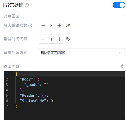 最大重试次数 | 节点运行异常时重新运行的最大次数。重试超过设定次数,认为该节点调用失败,执行下方的异常处理方式,默认为3次 |