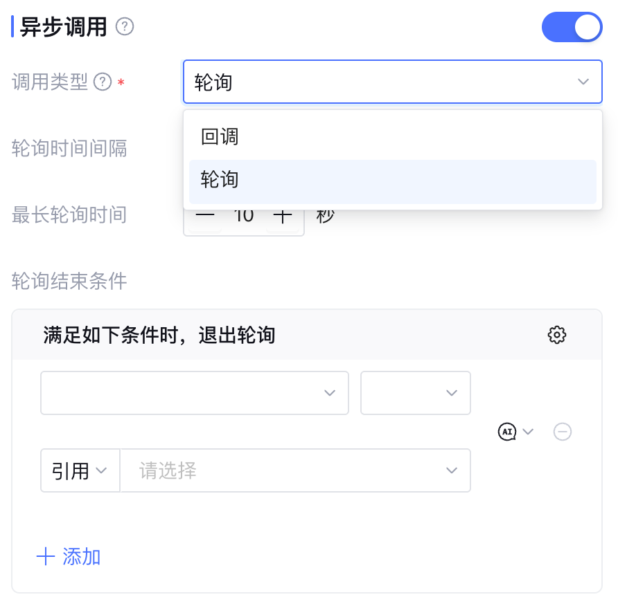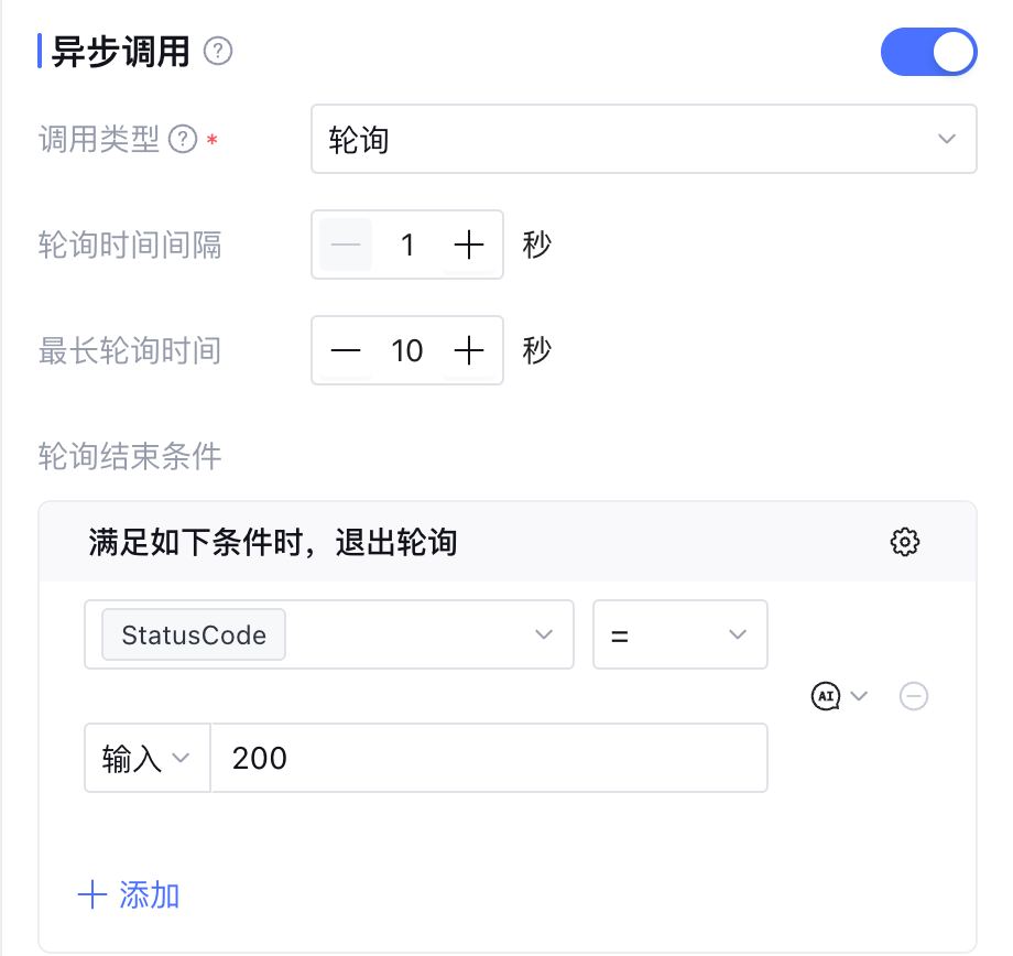 轮询结束条件 | 停止轮询的规则或条件,不满足条件时,接着进行轮询。当条件被满足时,结束轮询,执行下一节点 |