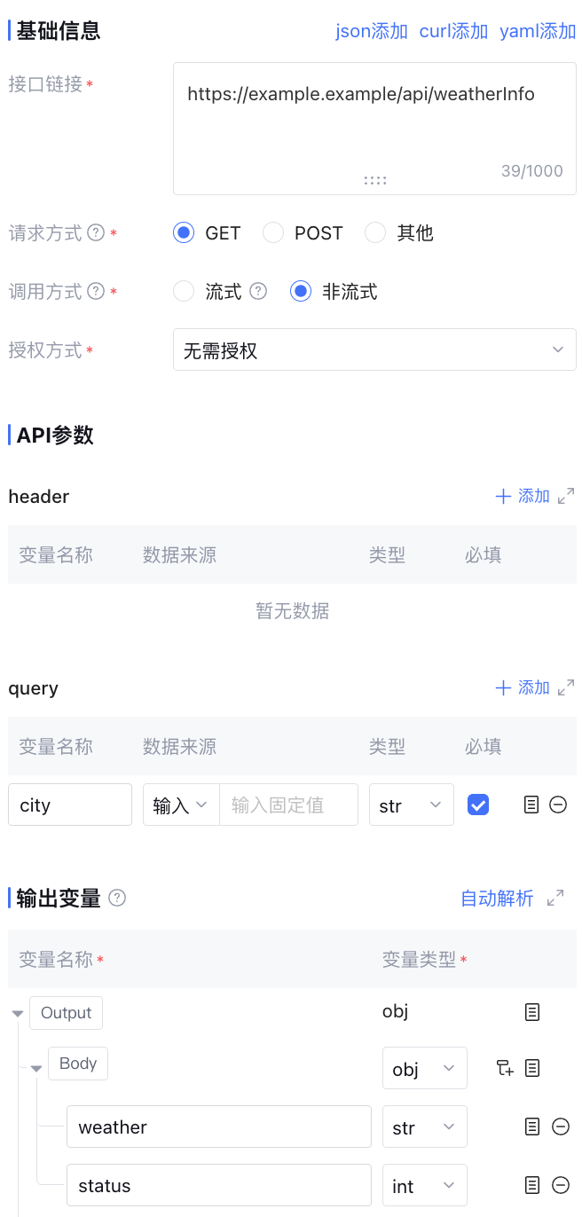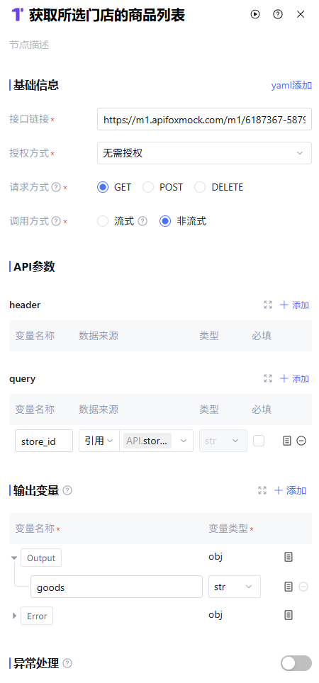 异常处理方式 | 支持“输出特定内容”、“执行异常流程”和“中断流程”三种 |