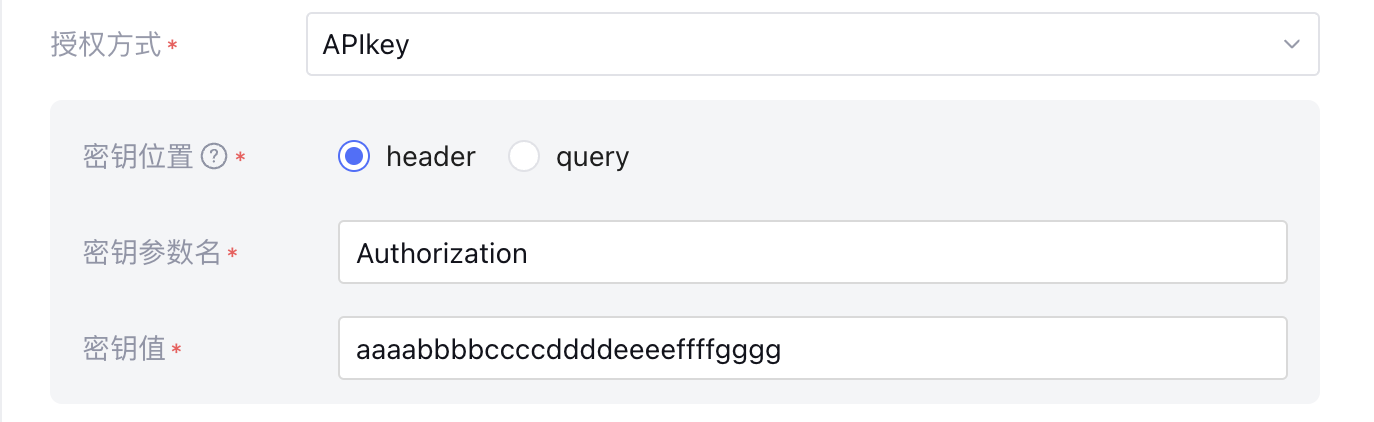 密钥位置 | 支持选择“header”和“query”,用于配置填写 APIKey 的位置 |