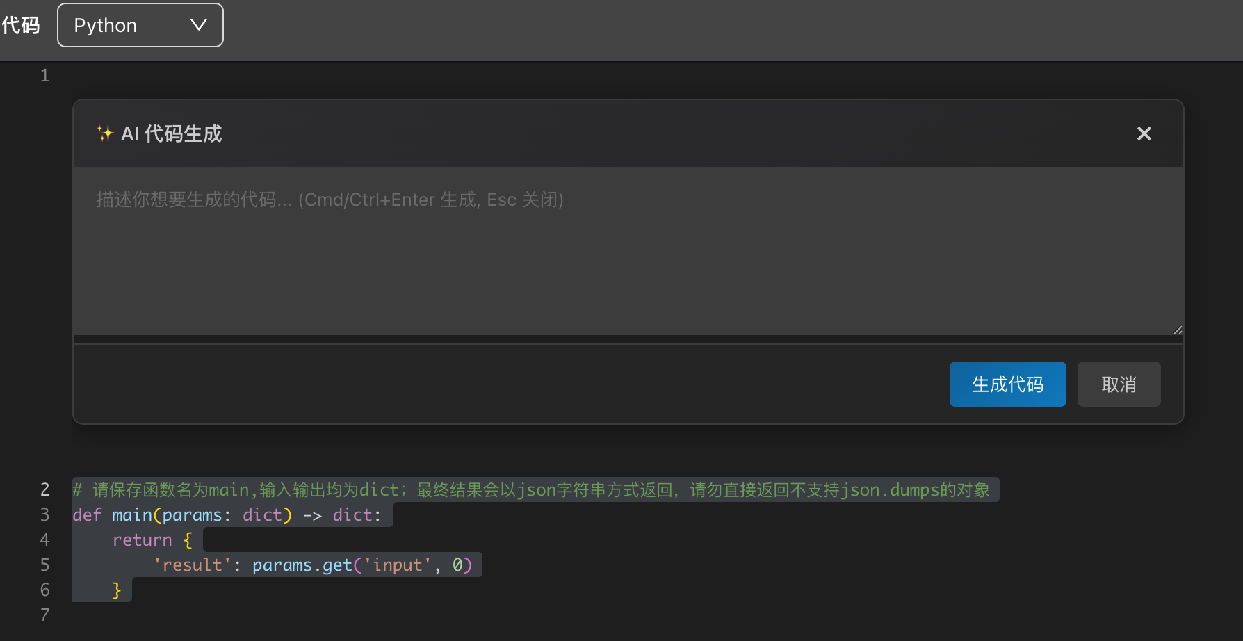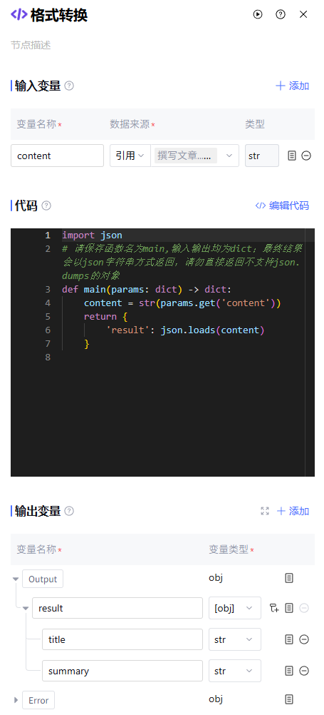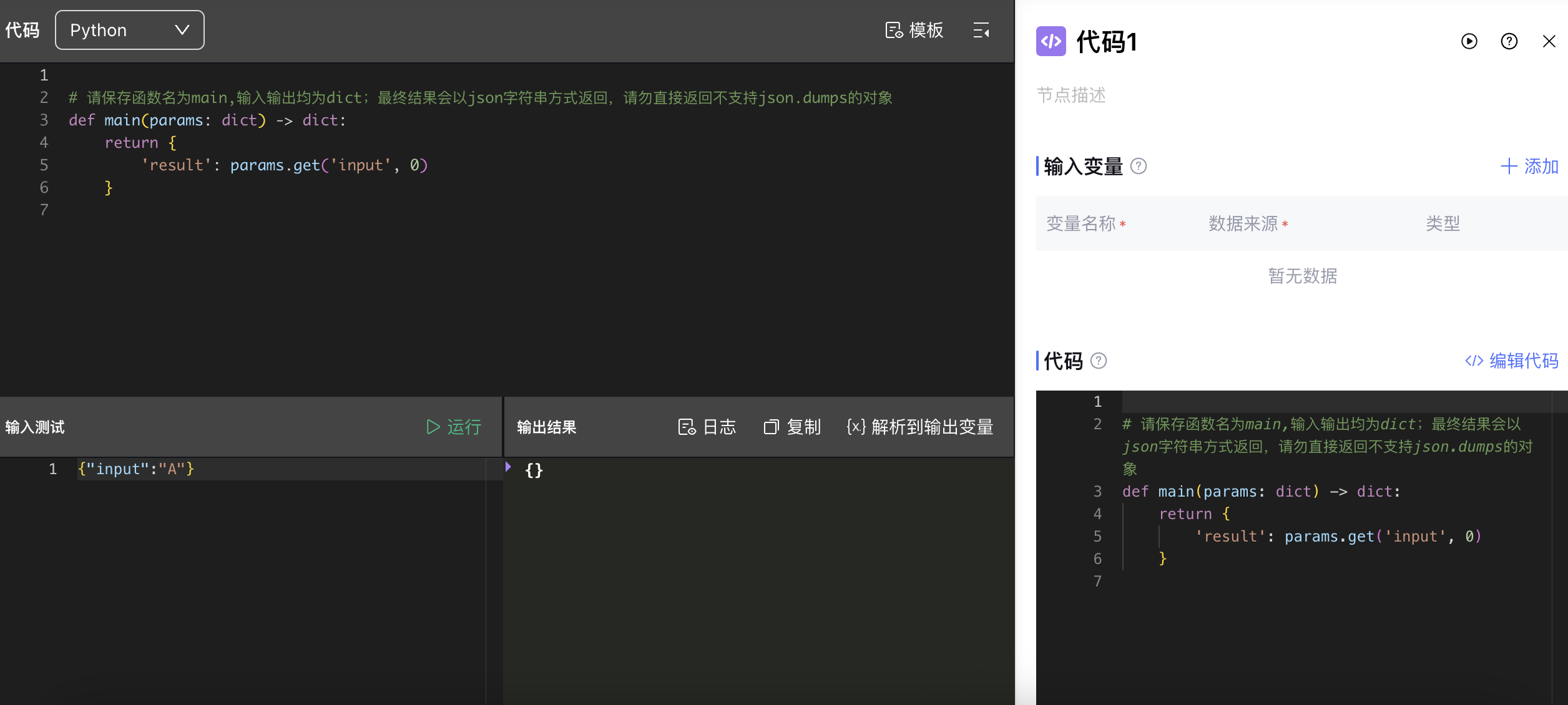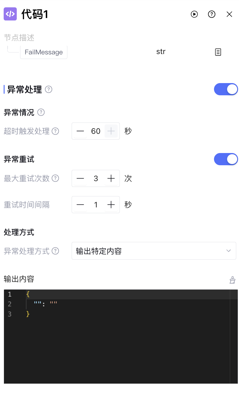 超时触发处理 | 节点运行的最大时长,超过时触发异常处理。代码节点的超时时间默认值为60s,超时时间设置范围为1-60s |