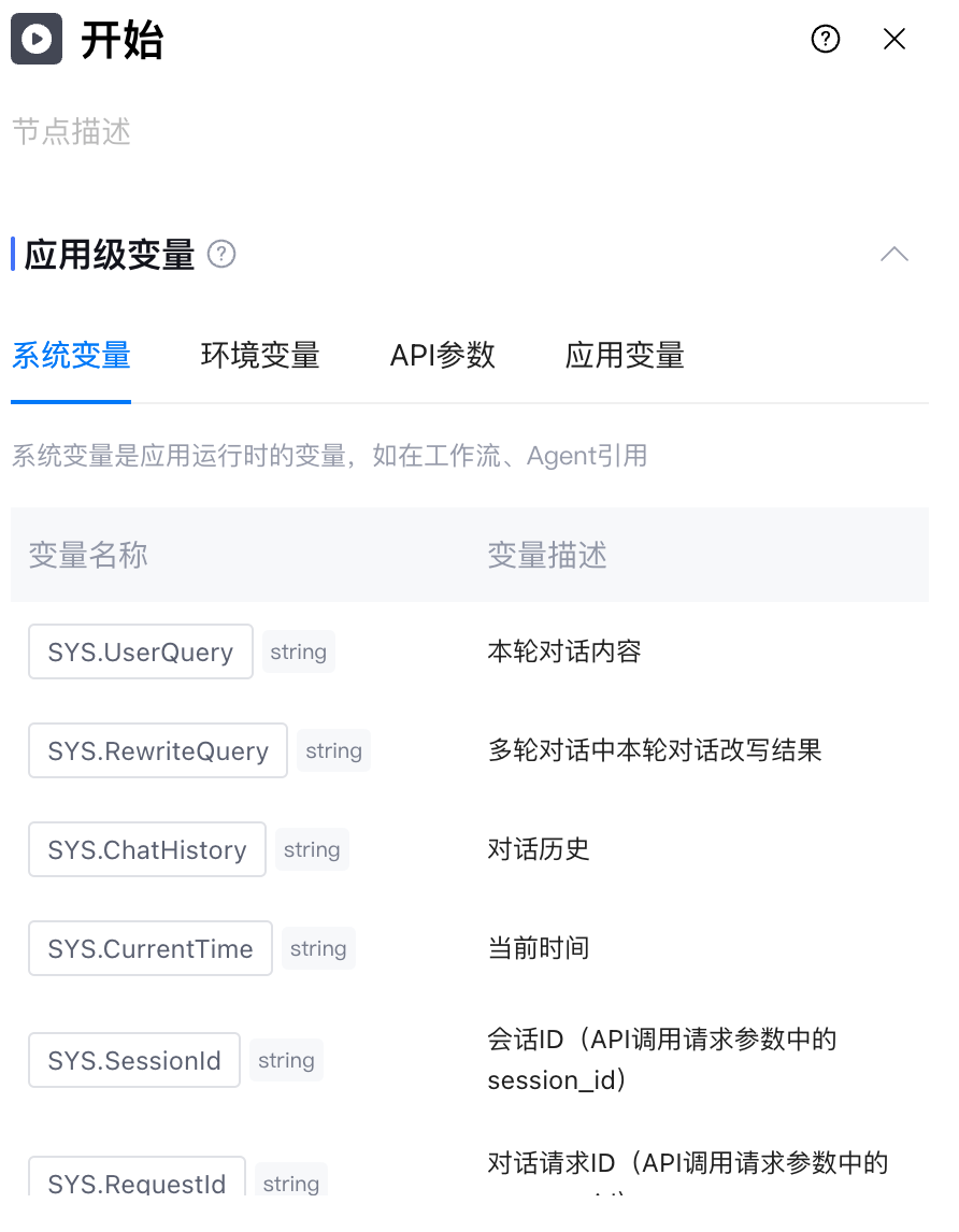 开始节点属于基础节点,用于标识工作流的启动,是整个工作流的入口。该节点展示了可在工作流节点中引用的多种应用级变量,同时支持根据实际需求添加以下两类变量: