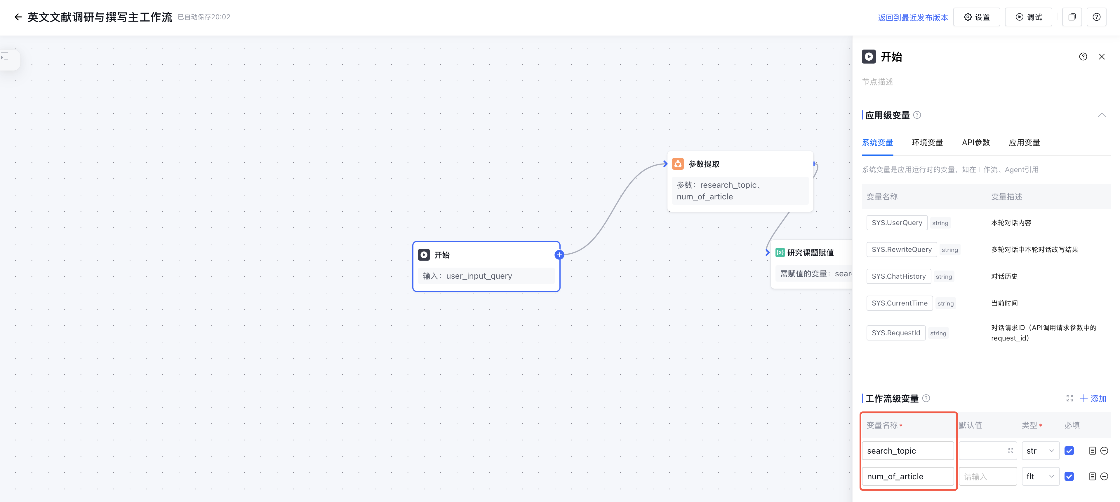 在“文献调研与撰写主工作流”中,调研主题(search_topic)和调研文献篇数(num_of_article)变量需要在当前工作流的各节点中都能被随时赋值和调用,此时可以在开始节点添加对应的工作流级变量: