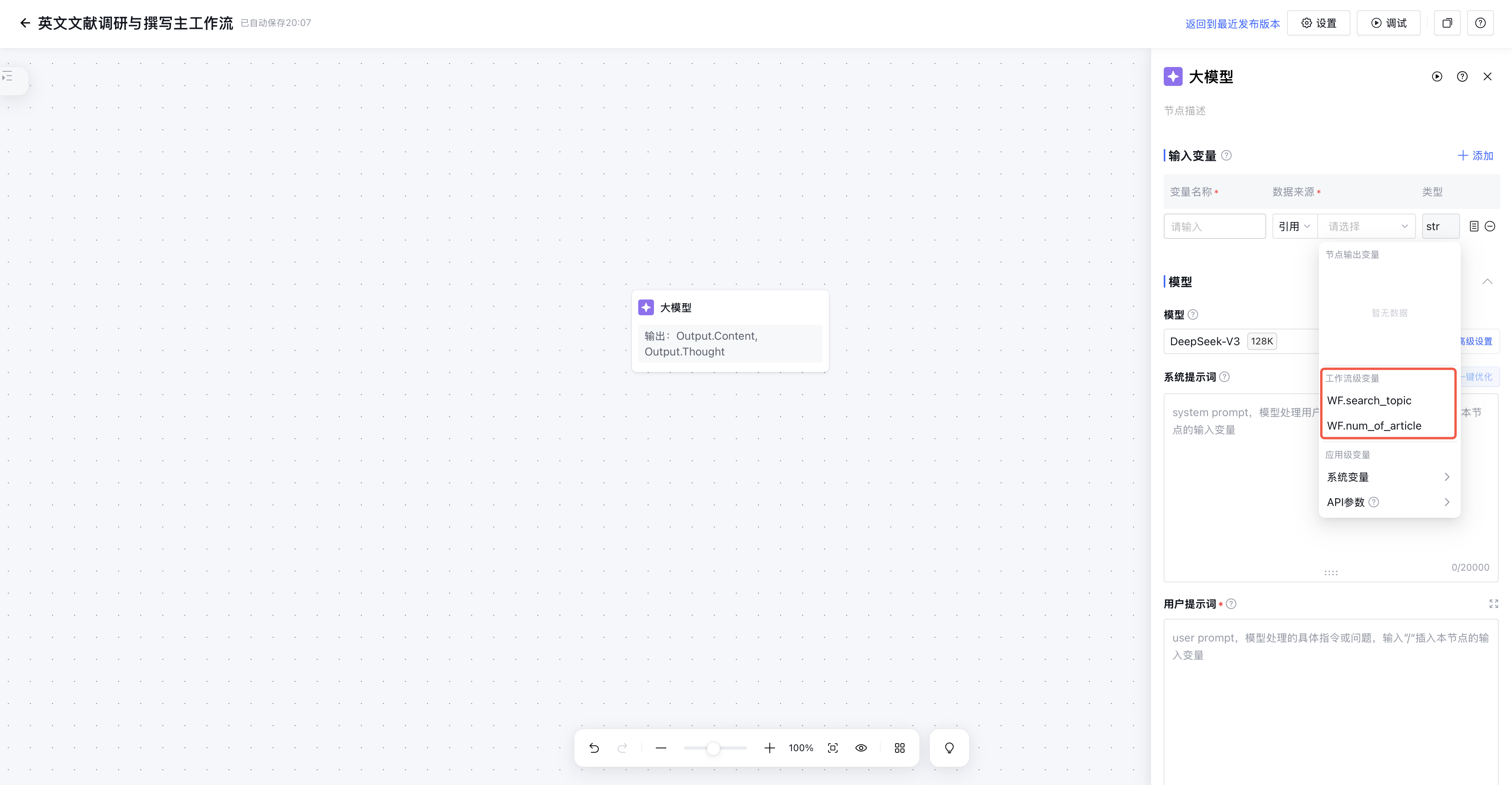 完成如上配置后,search_topic和num_of_article变量即可在“文献调研与撰写主工作流”的各节点中被全局使用(即使节点间不存在直接连接关系)。