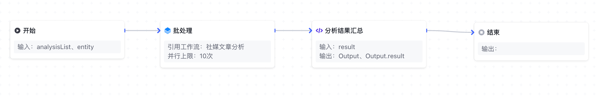 批处理节点和循环节点的区别:循环节点串行处理数组元素,依次执行循环体工作流,并且支持对每次循环执行结果进行条件判断,以实现提前结束循环,适合处理有关联关系的任务。批处理节点分批并行处理数组元素,不会提前结束批处理,适用于大量数据的并行处理场景,例如媒体文章的并行分析、数据预处理等,适合并行处理多个无关联的任务。