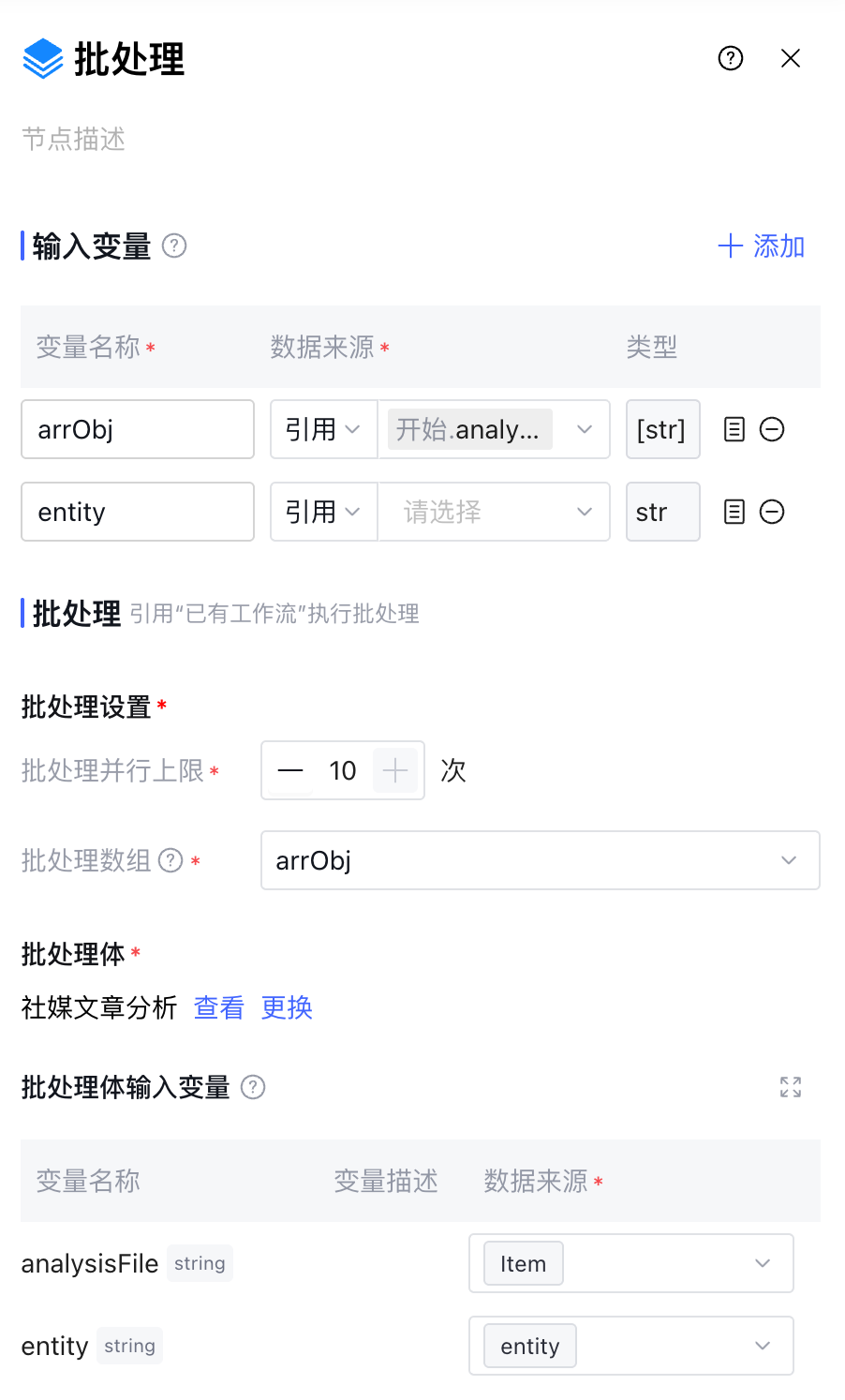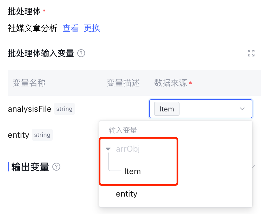 批处理体输入变量即所选择的批处理工作流的输入变量,支持引用批处理节点的输入变量以及批处理数组的元素(通过item字段引入,例如批处理数组为arrObj,则通过 arrObj.Item 引用该数组中的元素)。