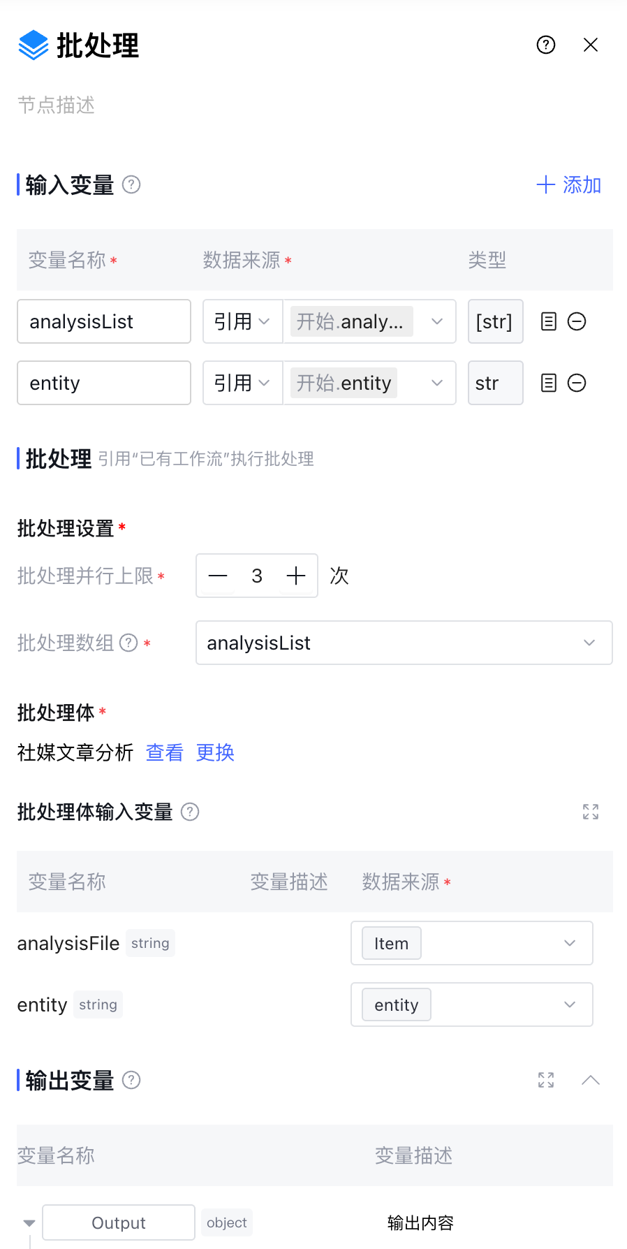 批处理节点用于批量并行的执行任务,直到遍历完批处理数组的全部元素。批处理节点属于基础节点,支持配置输入变量、批处理并行上限、批处理数组和批处理体(工作流),并行执行特定的工作流。