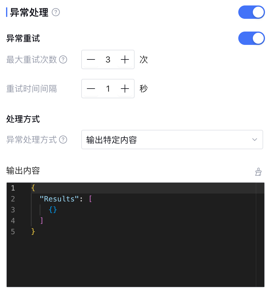 最大重试次数 | 节点运行异常时重新运行的最大次数。重试超过设定次数,认为该节点调用失败,执行下方的异常处理方式,默认为3次 |