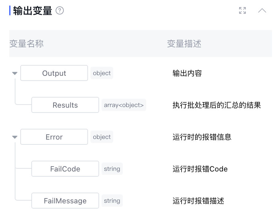 经该节点处理后的输出变量。包含批处理体运行后汇总的结果 Results(数据类型为array<object>),以及运行时报错信息Error(数据类型为 object,正常运行时该字段为空)。不支持用户手动新增。