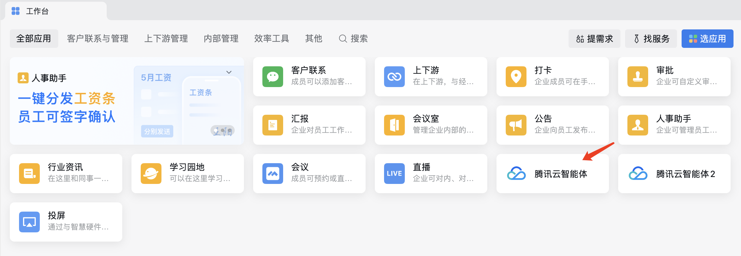 在企业微信工作台中,点击腾讯云智能体应用后可以开始对话。