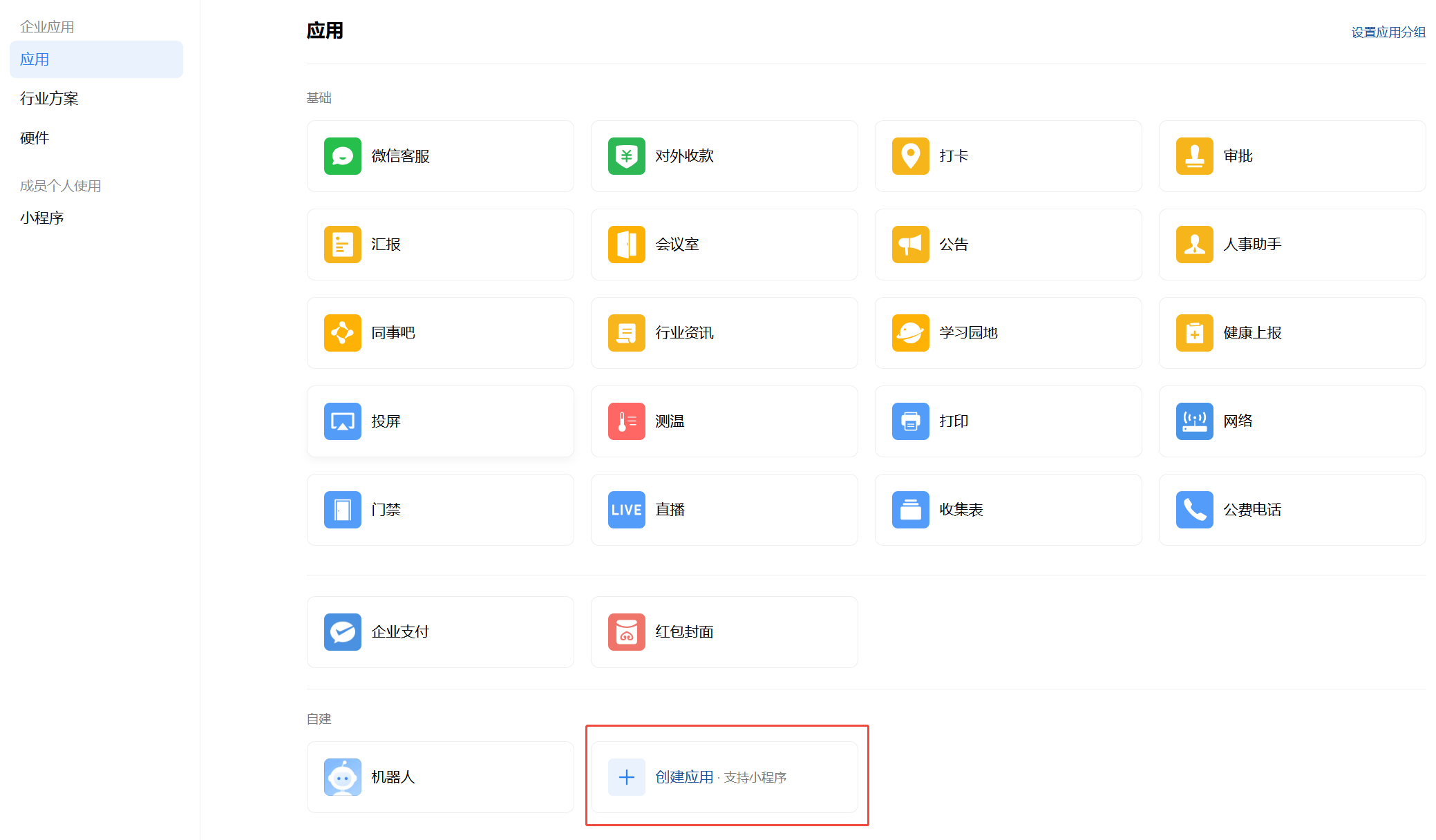 1. 登录企业微信,进入应用管理 > 应用,单击创建应用。