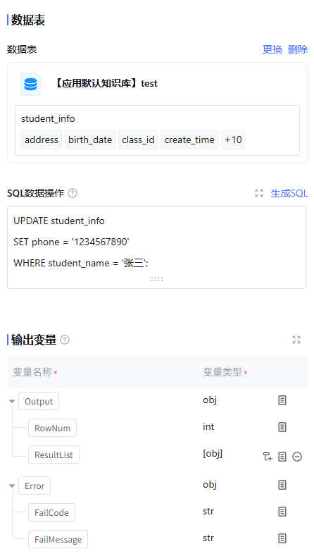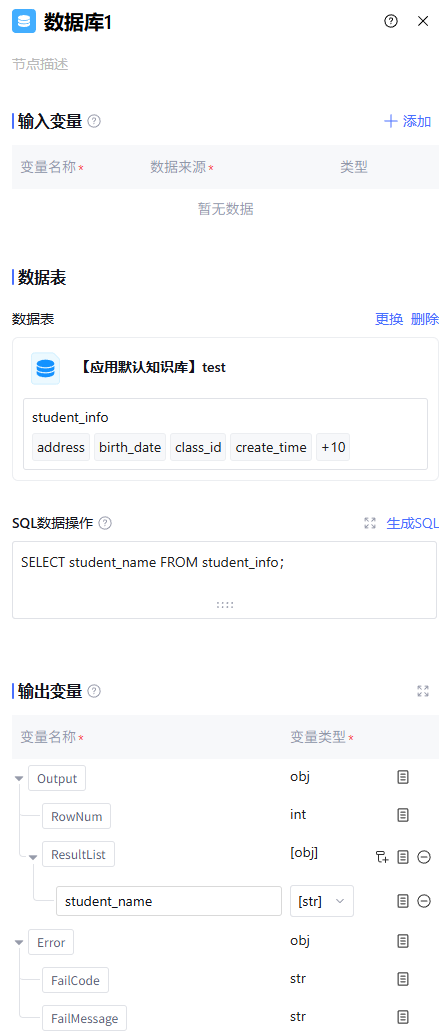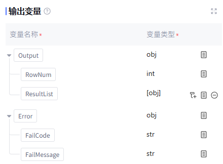 经该节点处理后的输出变量。默认包含数据表的行数、运行后数据结果 ResultList(数据类型为 array<object>),以及运行时报错信息 Error(数据类型为 object,正常运行时该字段为空)。支持用户在 ResultList 处根据 SQL 操作手动新增所需的输出变量。