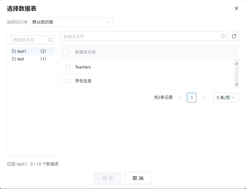 数据表是数据库中存储数据的基本结构,用来组织、存储和管理数据。每个表由行和列组成,每一行表示一条记录,包含一个具体的实例或数据,每个列表示数据的一个属性或特征。点击“添加”,支持选择数据表进行数据操作。允许选择一个数据库下的最多10个数据表。
