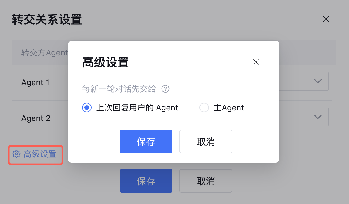 转交关系-高级设置中,支持配置每一轮对话起始 Agent:每次任务结束后,下一轮对话由上次回复的 Agent 接收还是主 Agent 接收。
