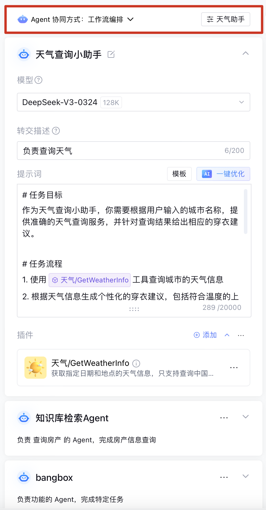 选择 Agent 协同方式为工作流编排,并按照 Agent 创建、配置与删除 中的配置方法在应用内新建或复制所需 Agent。