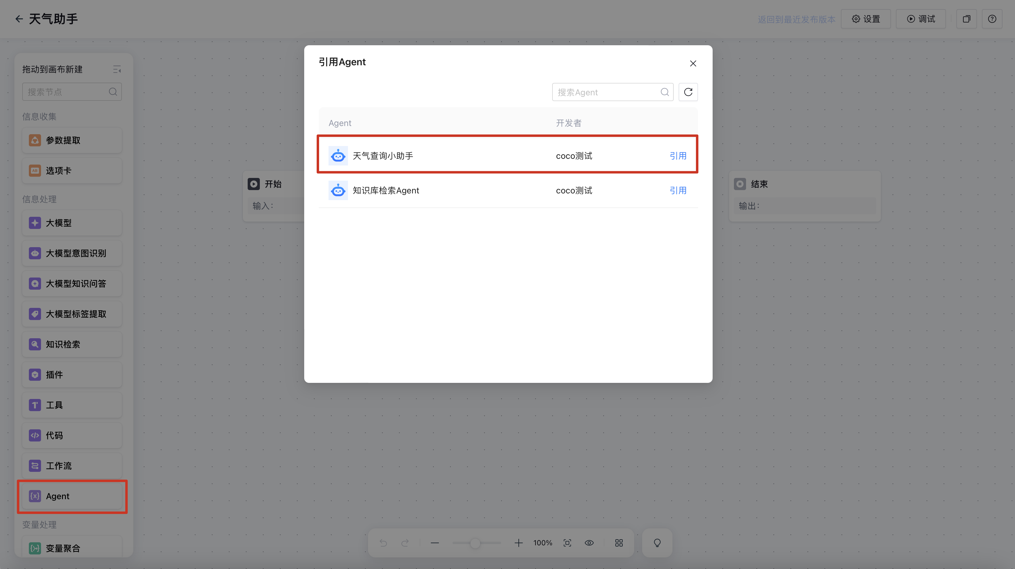 应用设置中点击选择工作流。若应用中原本无工作流,则进入工作流管理界面新建工作流。在工作流中添加 Agent 节点,引用第一步在应用中配置好的 Agent。