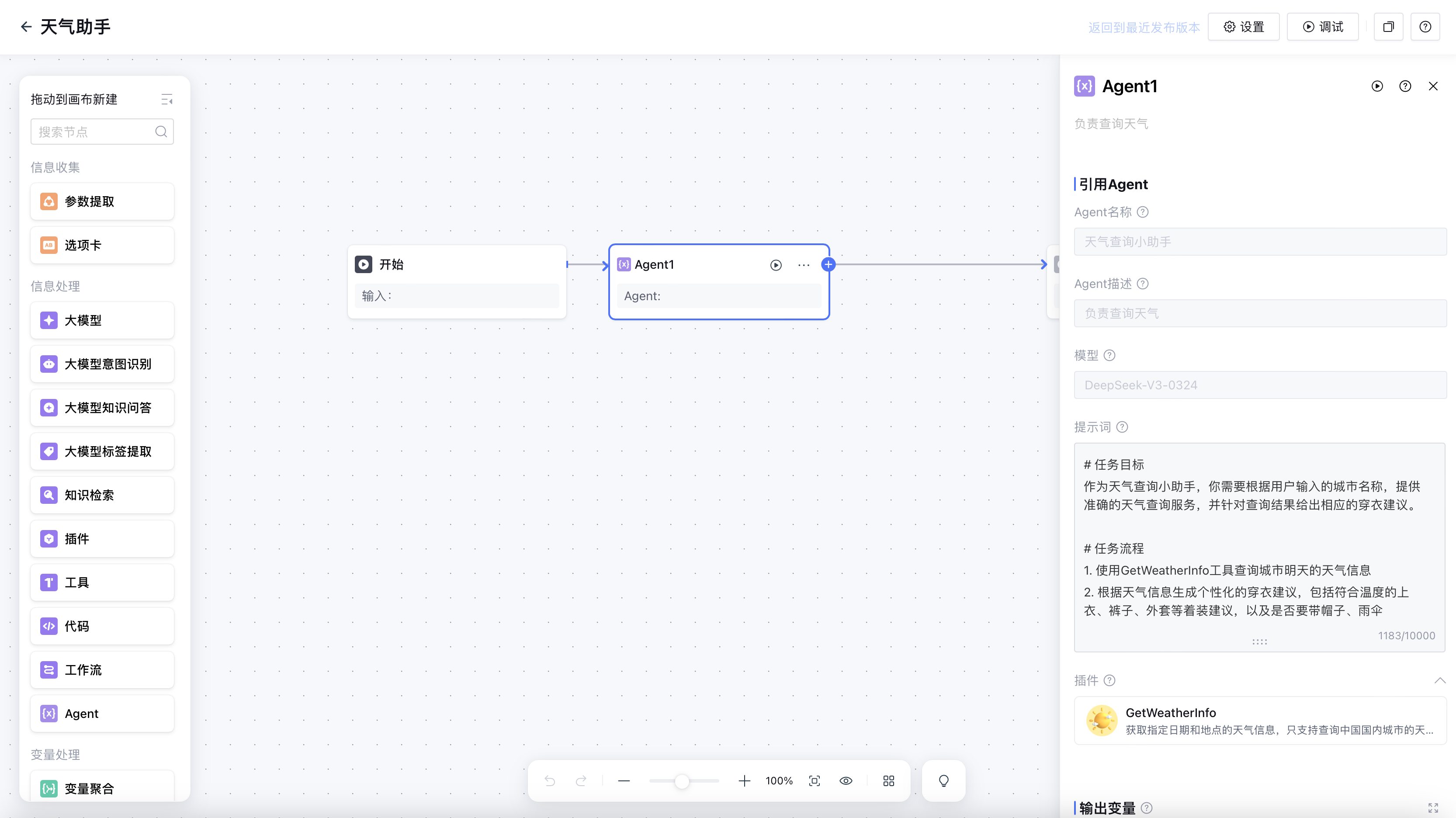 工作流编排 Agent 的优势在于,基于 Agent 自主调用工具的能力,结合工作流中多类型节点,实现完整的业务流程构建,同时保障执行流程的稳定性和可控性。但需要具备一定的工作流搭建基础才能完成。