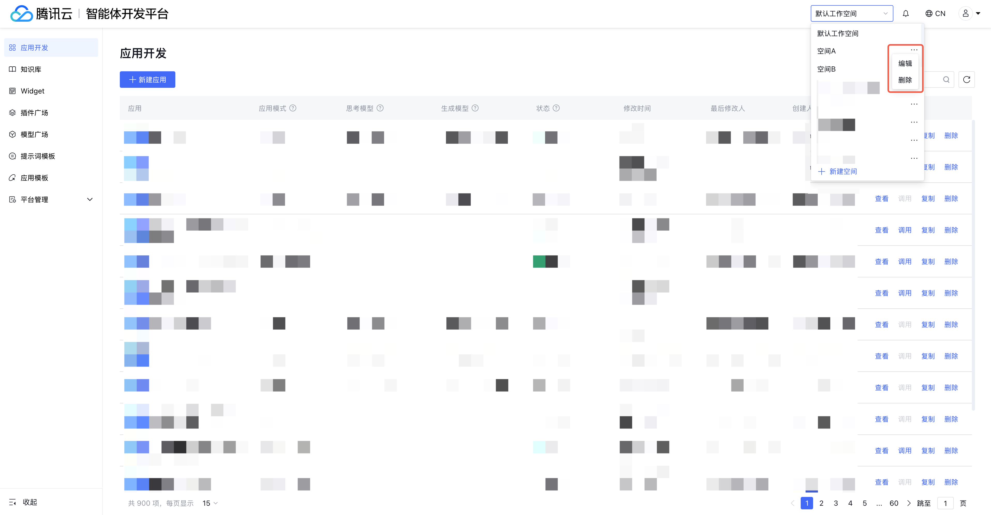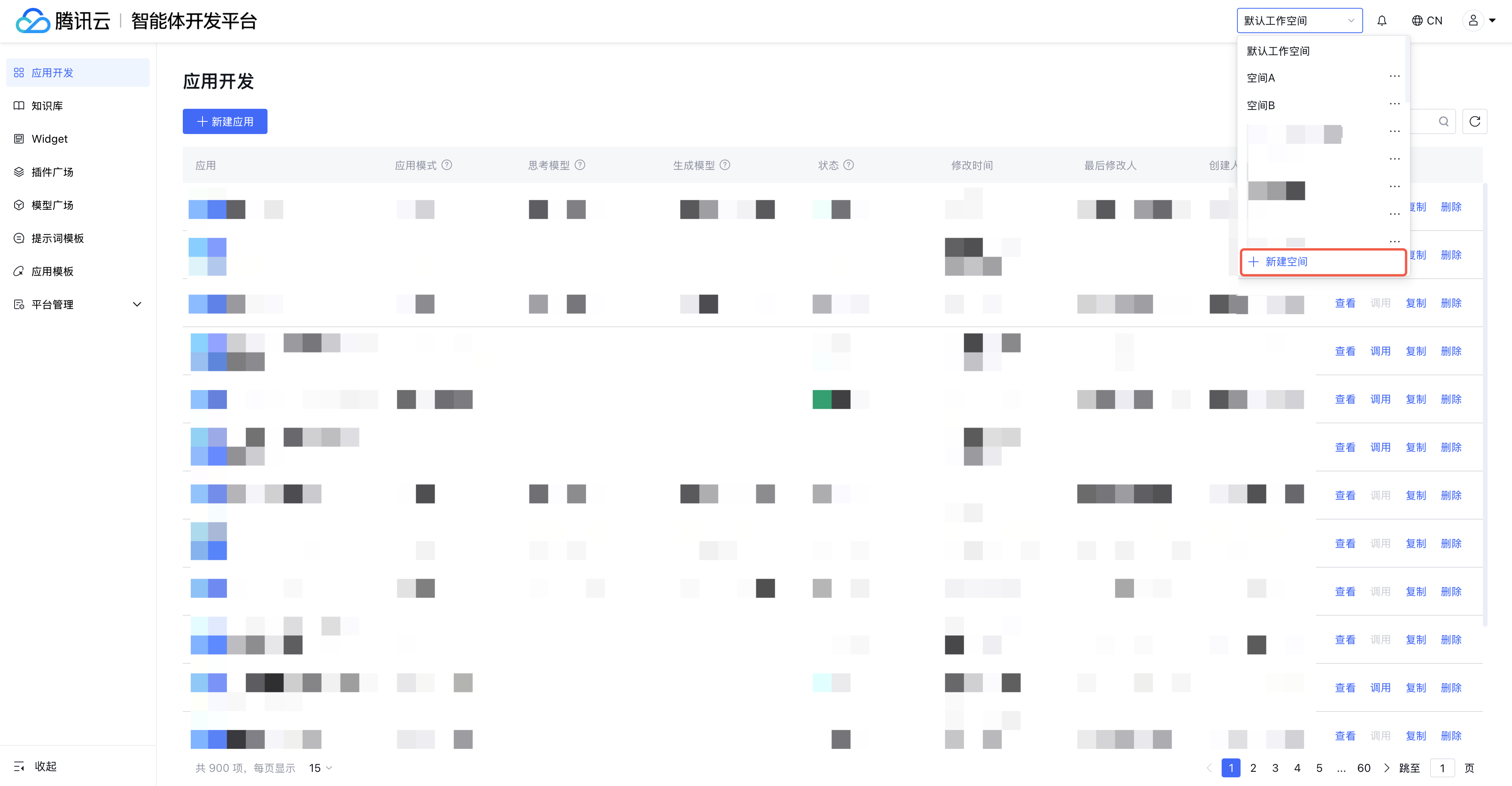 一个工作空间代表一个独立的工作区域,空间成员可以共享其内部的数据资源,不同工作空间之间数据隔离。在智能体开发平台中,空间内可共享的数据包括应用、知识库、自定义插件及自定义的提示词模板。工作空间属于企业下,一个企业下可以创建20个工作空间。