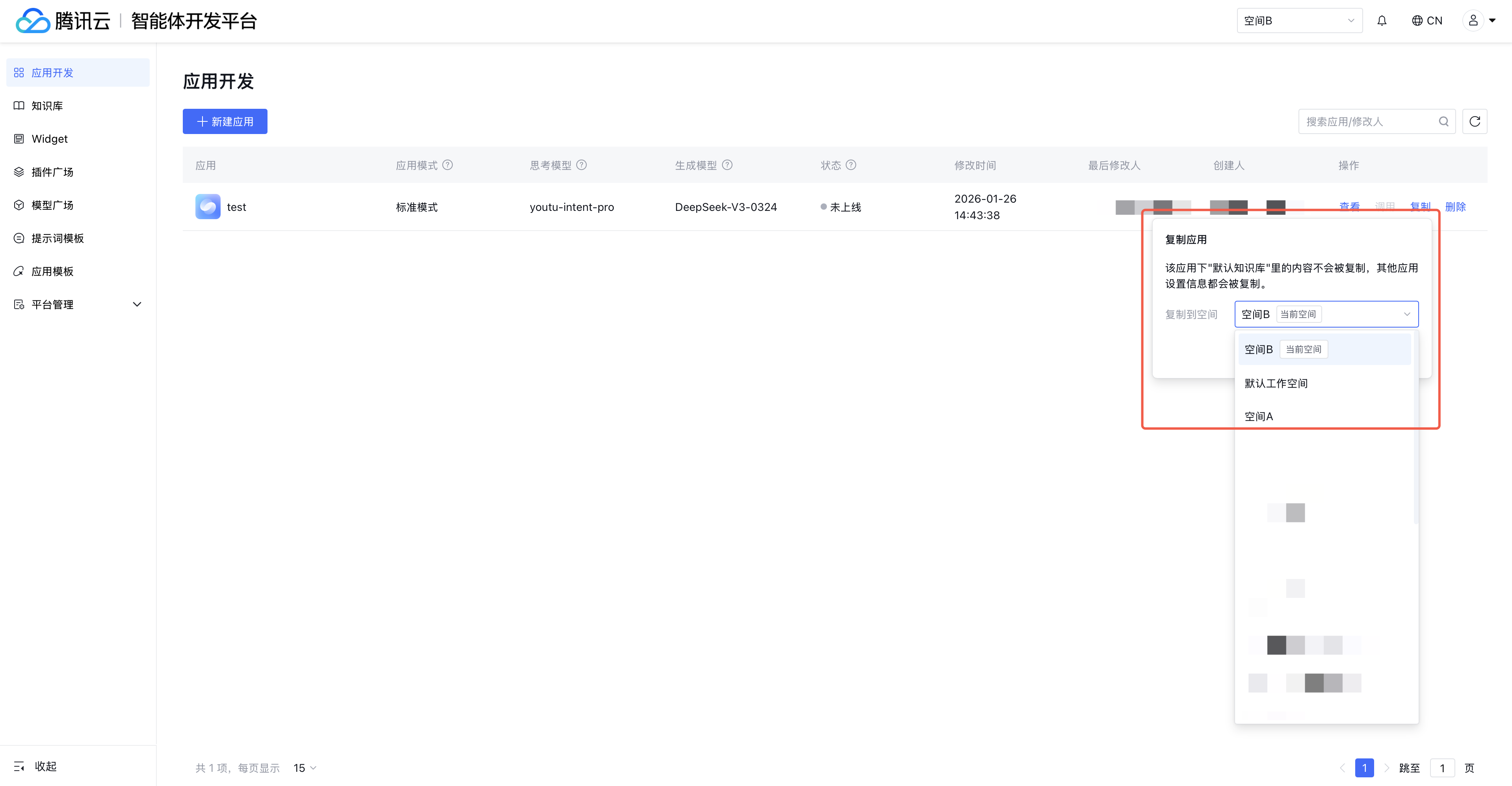 产品上支持在空间内和跨空间复制应用的功能。进入工作空间之后,在应用开发页面点击复制应用,支持选择当前空间或其他可访问的空间复制应用。