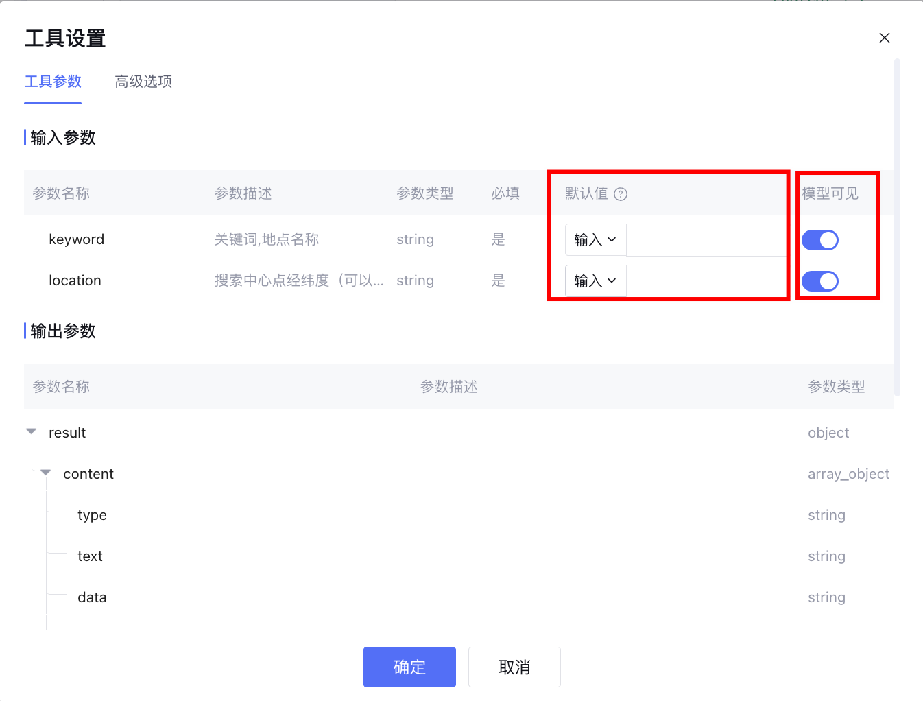 工具设置用于管理 Agent 调用工具时的输入参数配置和输出内容格式。