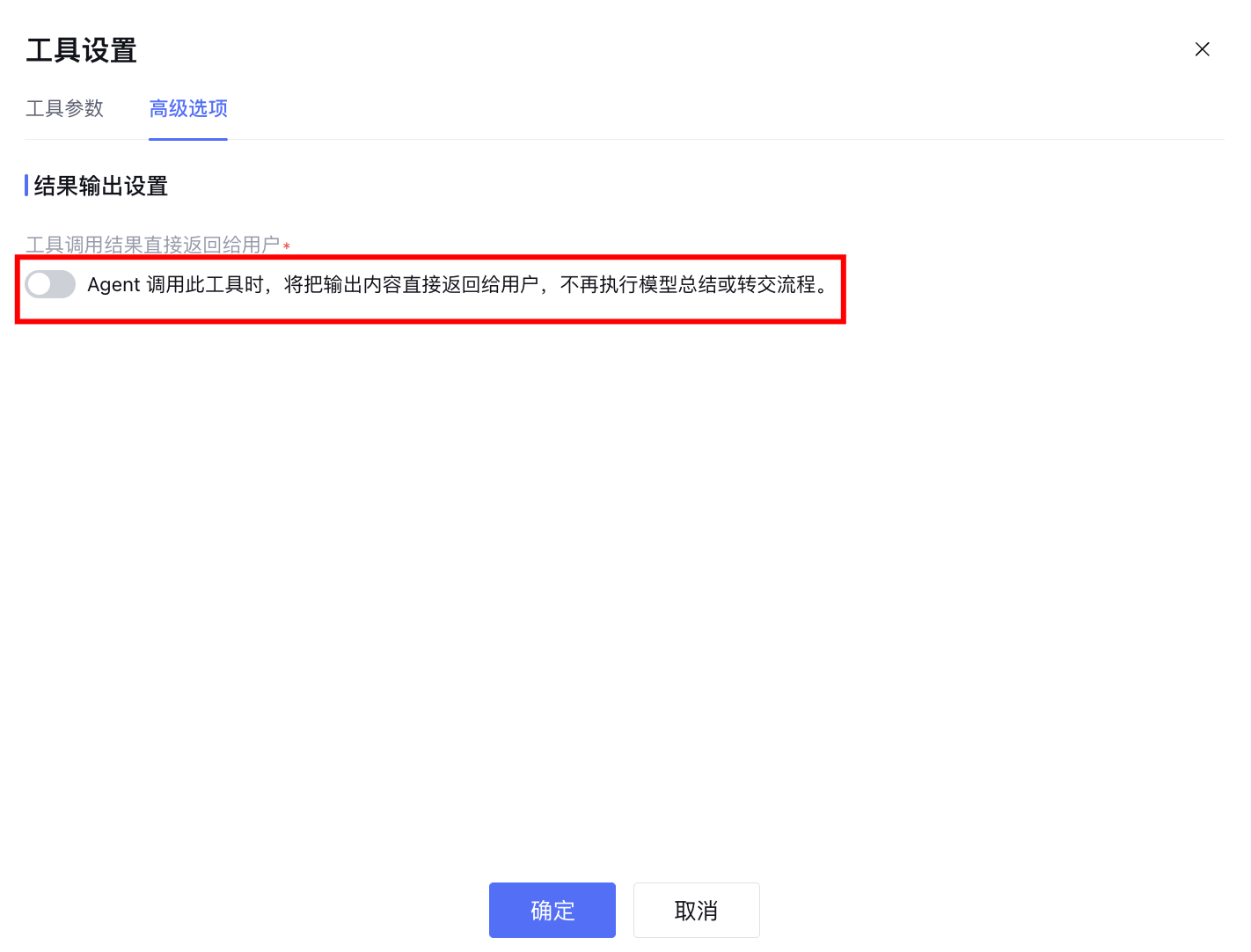 开启后,当 Agent 调用该工具时,工具返回的结果将直接作为最终输出展示给用户,不再进入模型总结、改写或转交流程。