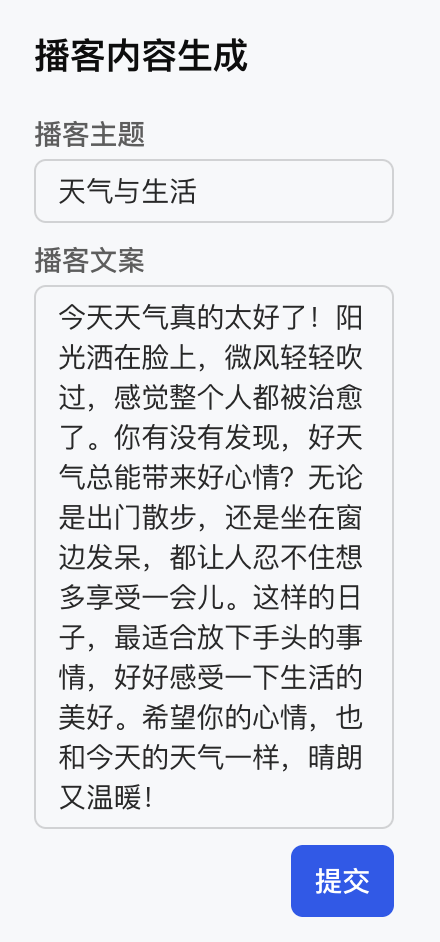 defaultValue 预填到输入组件中,用户修改后,通过 Action 将用户修改后的内容传回智能体。其中 defaultValue 仅用于初始内容展示,作为用户修改的起点,不会直接返回给智能体,真正参与后续推理的内容是用户在输入组件中修改并提交的最终值。initialObject 和 initialScript 的初始默认值作为播客主题及文案的初稿,并通过 defaultValue 预填到输入框中,用户修改后提交表单,智能体最终接收的值是用户确认修改后的播客主题及文案,而非初始默认值。总之,defaultValue 只是展示给用户的初稿,智能体始终接收并处理用户提交的最终结果。<FormonSubmitAction={{type: 'sys.chat',payload: { type: 'submit_form' },}}><Title value="播客内容生成" size="sm" /><Label value="播客主题" /><Input name="object" defaultValue={initialObject} /><Label value="播客文案" /><Textareaname="script"defaultValue={initialScript}rows={10}autoResizerequired/><Row><Spacer /><Button submit label="提交" style="primary" /></Row></Form>