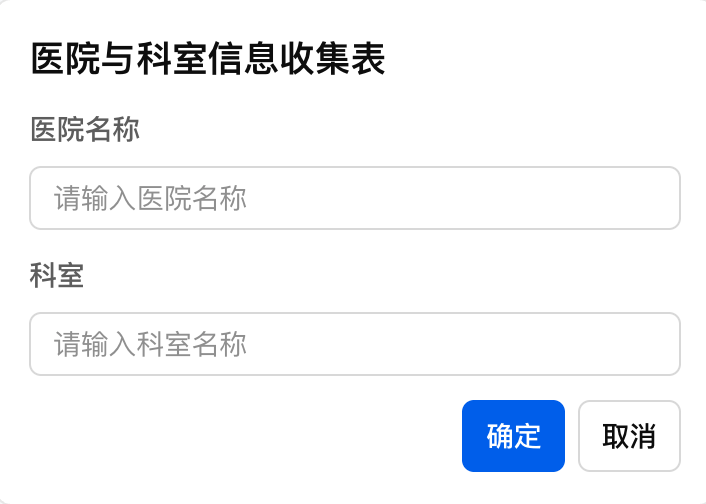 name字段,用于标识提交参数的字段名。name作为字段名提交对应值。<Card size="sm"><FormonSubmitAction={{type: 'sys.chat',payload: { result: 'submit' },}}><Col gap={3}><Title value="医院与科室信息收集表" size="sm" /><Col gap={3}><Col gap={2}><Label value="医院名称" /><Input name="hospital" placeholder="请输入医院名称" /></Col><Col gap={2}><Label value="科室" /><Input name="department" placeholder="请输入科室名称" /></Col></Col><Row><Spacer /><Button submit label="确定" style="primary" /><Buttonlabel="取消"variant="outline"onClickAction={{type: 'sys.chat',payload: { query: '取消填写' },}}/></Row></Col></Form></Card>