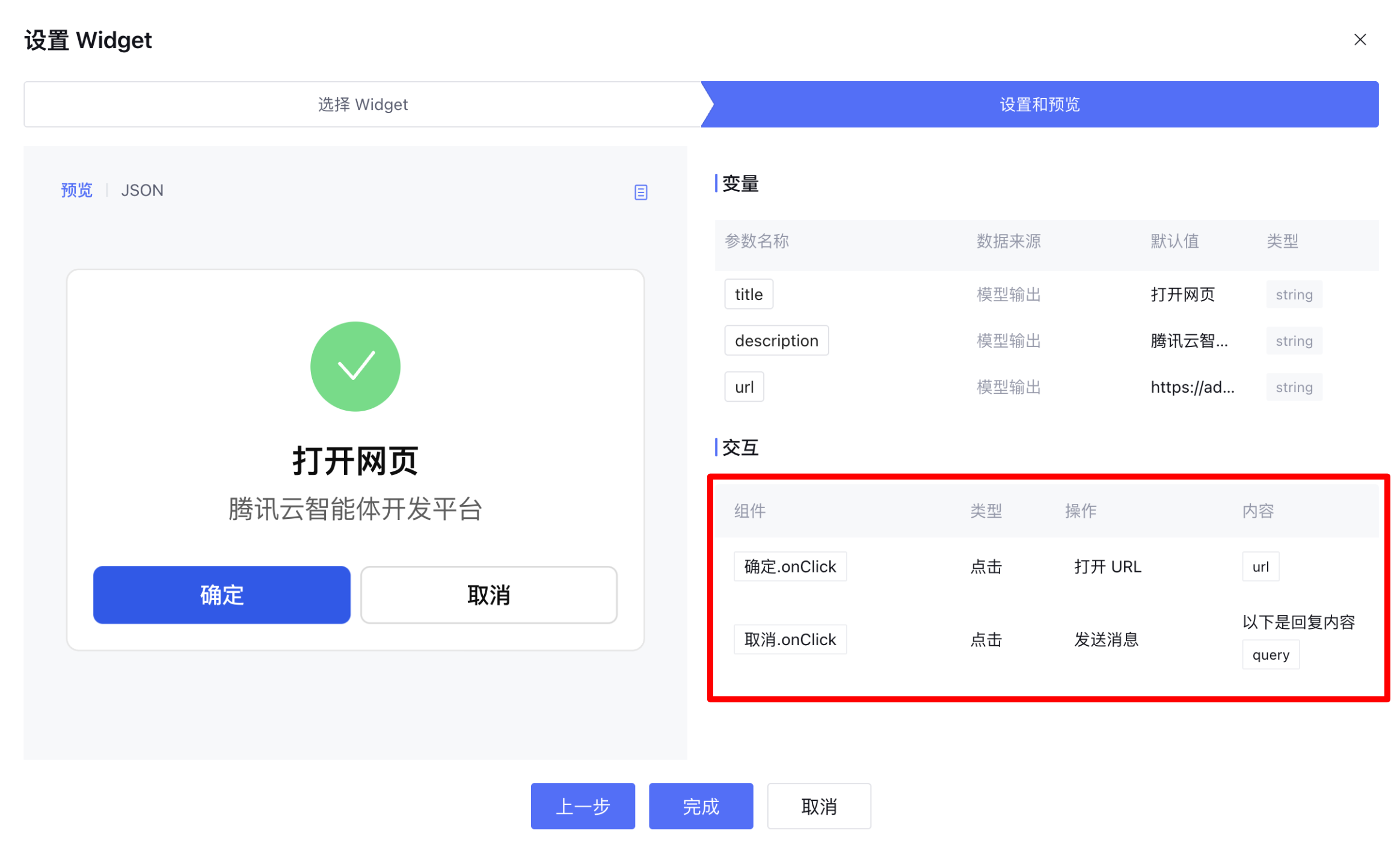 Widget 节点详情正确配置 Action 的回显 | Widget 节点详情错误配置 Action 的回显 |