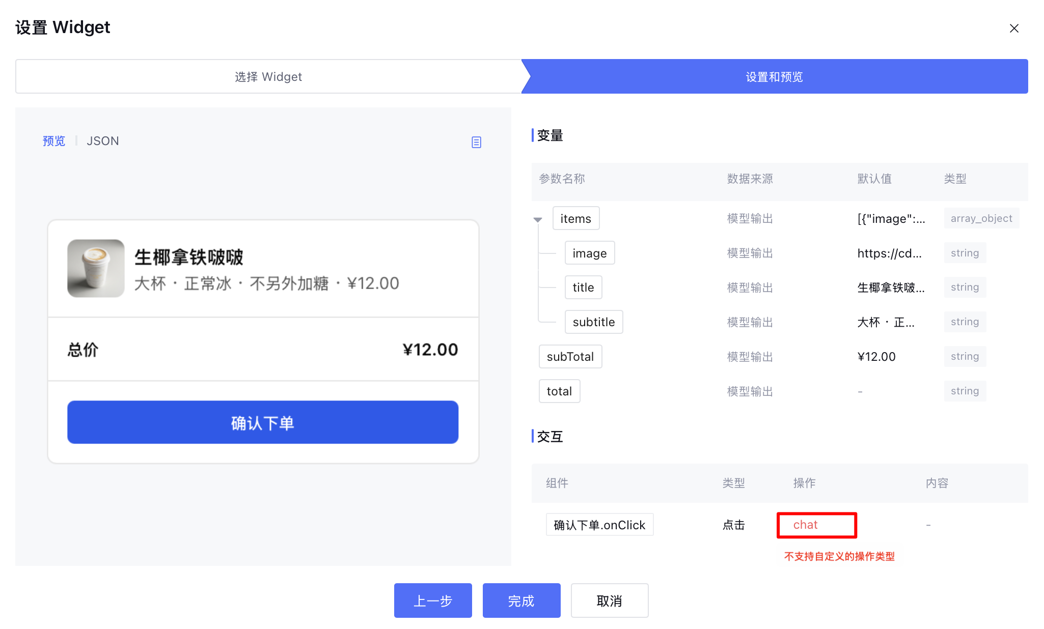 sys.chat 用于向智能体发送一条对话消息,当用户在 Widget 中触发该 Action 时,系统会将指定内容作为新的用户输入进入当前对话的上下文,参与后续的推理、判断与流程决策。<Buttonlabel="重新选择"onClickAction={{type: "sys.chat",payload: { query: "重新选择方案" } }} />