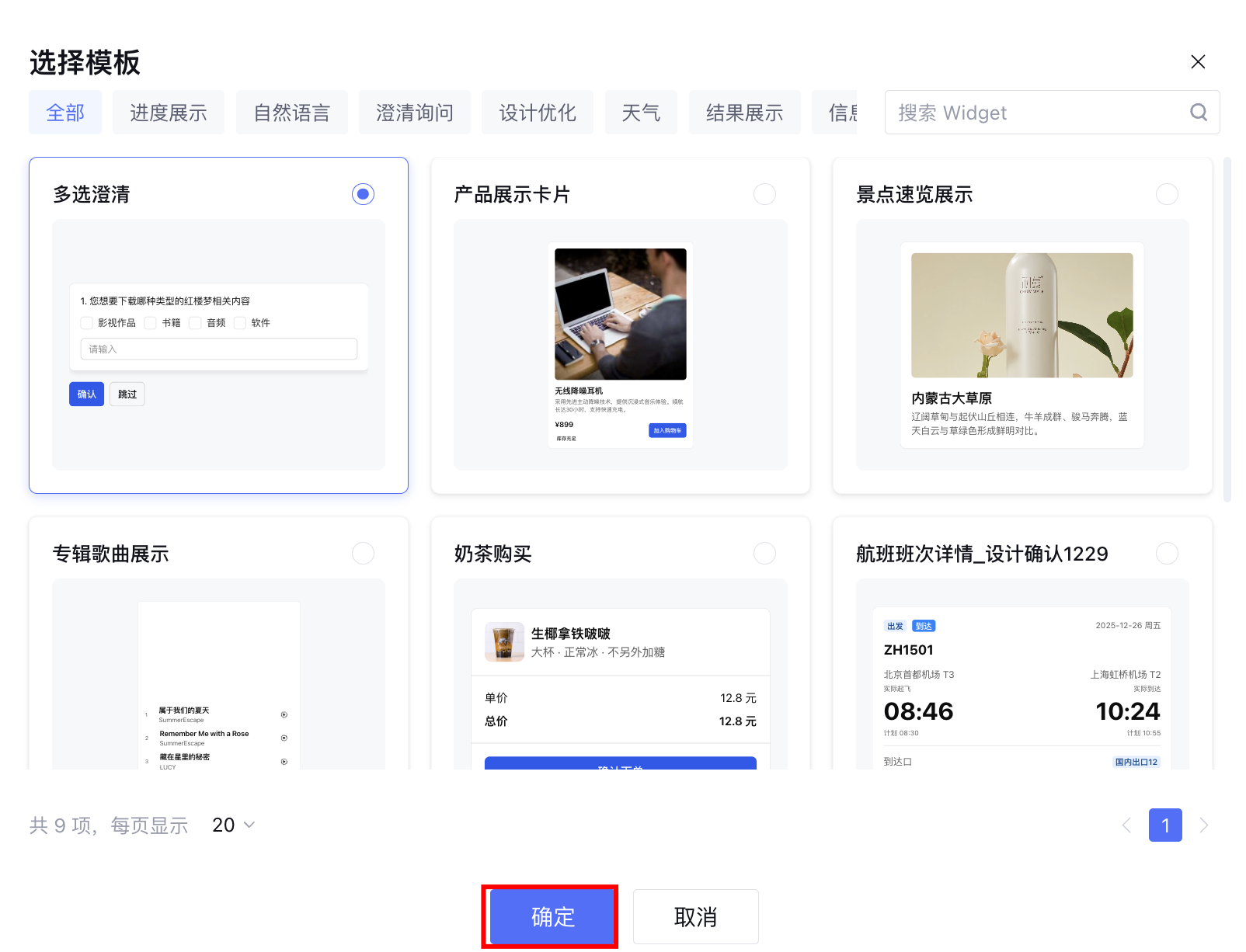 平台预置了多种常用场景下的 Widget 模板,例如澄清询问、信息确认等,帮助用户快速创建可用的 Widget。