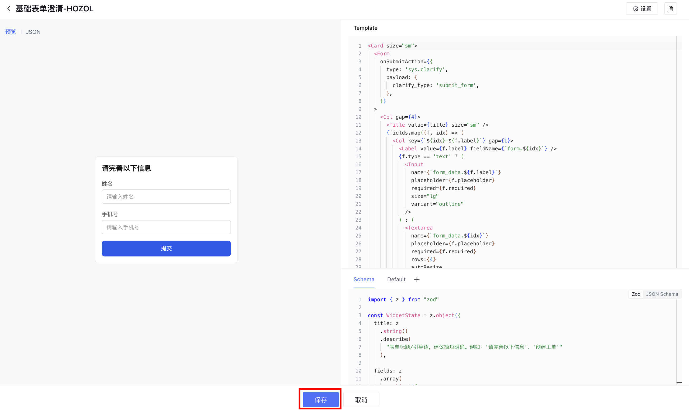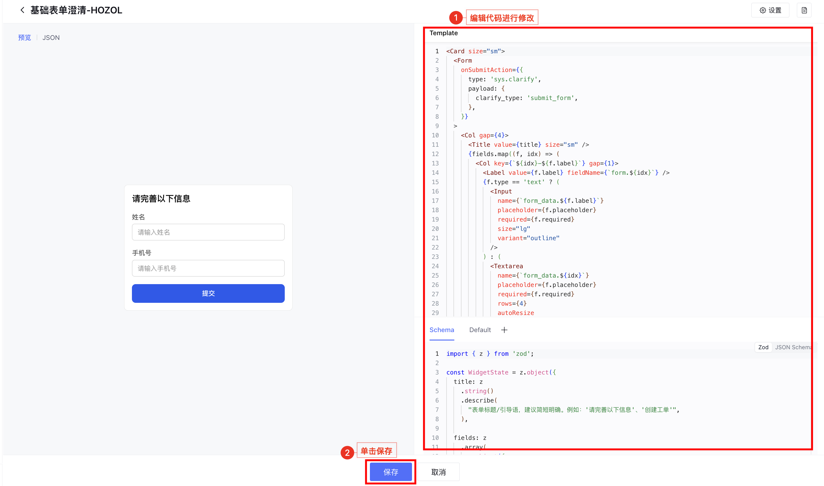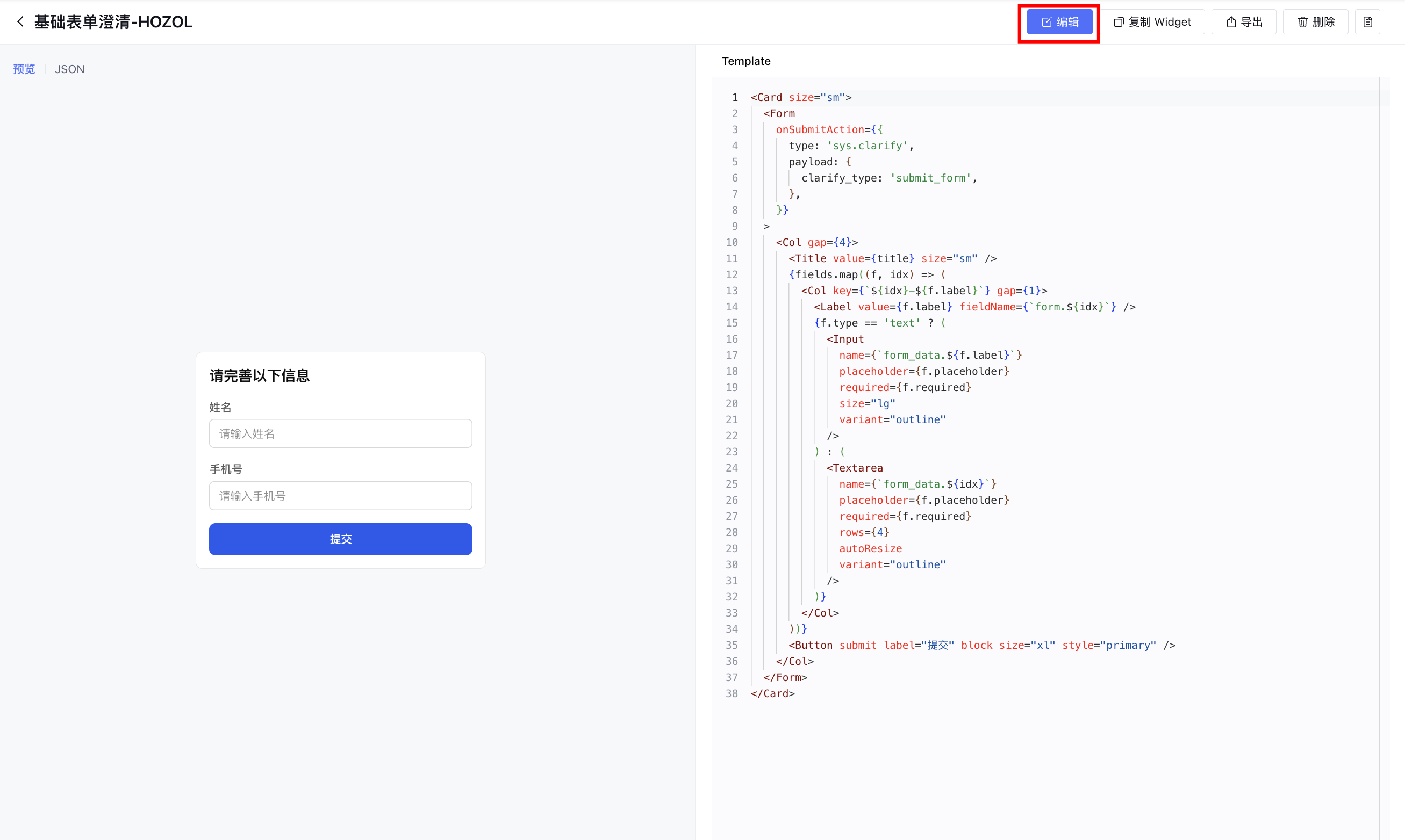 单击编辑,通过编辑 Template、Schema、 Default 修改 Widget 的展示形式,然后保存。具体的组件使用和编辑方法,详情请参见 Widget 组件