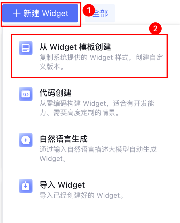 在 Widget 开发页面单击新建 Widget,选择从 Widget 模板创建