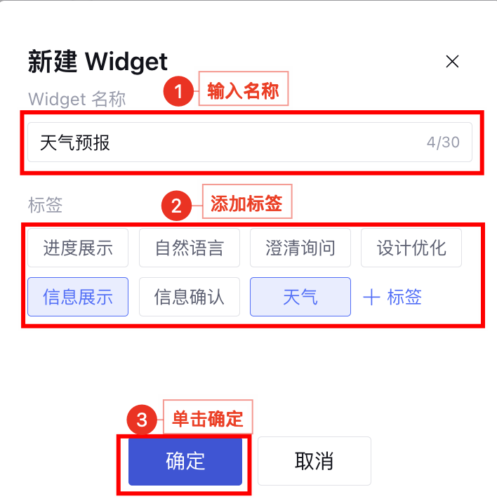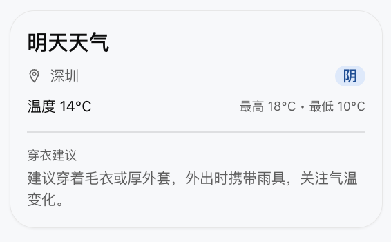 <Card size="sm"> {/* 创建小尺寸卡片容器,作为Widget的主体框架 */}<Col gap={2}> {/* 垂直布局容器,子元素间距为2个单位 */}{/* 标题区域 */}<Title value="明天天气" size="md" /> {/* 显示Widget标题,中等字号 */}{/* 位置和天气状态行 */}<Row gap={2}> {/* 水平布局容器,子元素间距为2个单位 */}<Icon name="map-pin" size="sm" color="secondary" /> {/* 位置图标,小尺寸,次要颜色 */}<Text value={city} size="sm" color="secondary" /> {/* 城市名称,绑定city变量 */}<Spacer /> {/* 弹性空白区域,将后续元素推到右侧 */}<Badge label={condition} color="info" /> {/* 天气状况标签,绑定condition变量 */}</Row>{/* 温度信息行 */}<Row gap={2}> {/* 水平布局容器,子元素间距为2个单位 */}<Text value={`温度 ${temp}°C`} size="sm" /> {/* 当前温度,使用模板字符串绑定temp变量 */}<Spacer /> {/* 弹性空白区域,将后续元素推到右侧 */}<Caption value={`最高 ${high}°C • 最低 ${low}°C`} /> {/* 最高最低温度,小号文本 */}</Row></Col><Divider /> {/* 分割线,分隔不同内容区域 */}{/* 穿衣建议区域 */}<Col gap={1}> {/* 垂直布局容器,较小间距 */}<Caption value="穿衣建议" /> {/* 区域标题 */}<Text value={advice} size="sm" color="secondary" /> {/* 穿衣建议内容,绑定advice变量 */}</Col></Card>