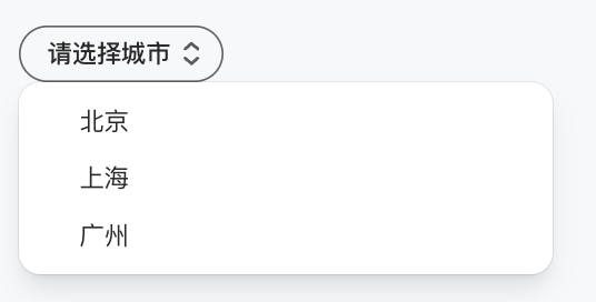 <Selectname="city"placeholder="请选择城市"options={[{ value: "beijing", label: "北京" },{ value: "shanghai", label: "上海" },{ value: "guangzhou", label: "广州" }]}/>
