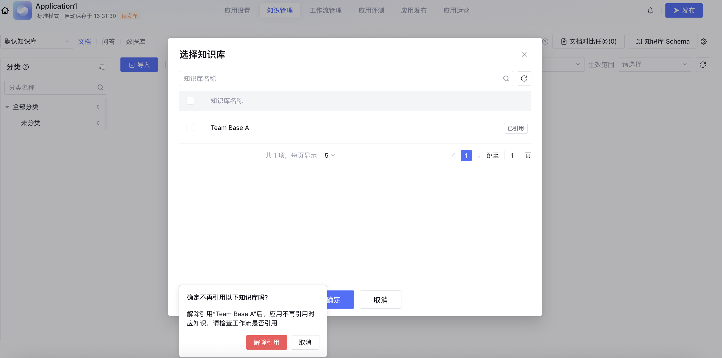 若希望取消与某个知识库的关联关系,点击添加知识库,取消勾选目标知识库,再点击确认,即可解除引用关系。