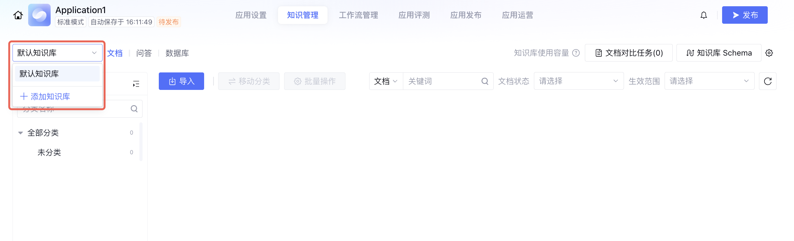 每个应用内预设一个默认知识库,该知识库内的数据无法被其它应用引用。如需在应用内添加平台级知识库,单击应用 > 知识管理 > 添加知识库。
