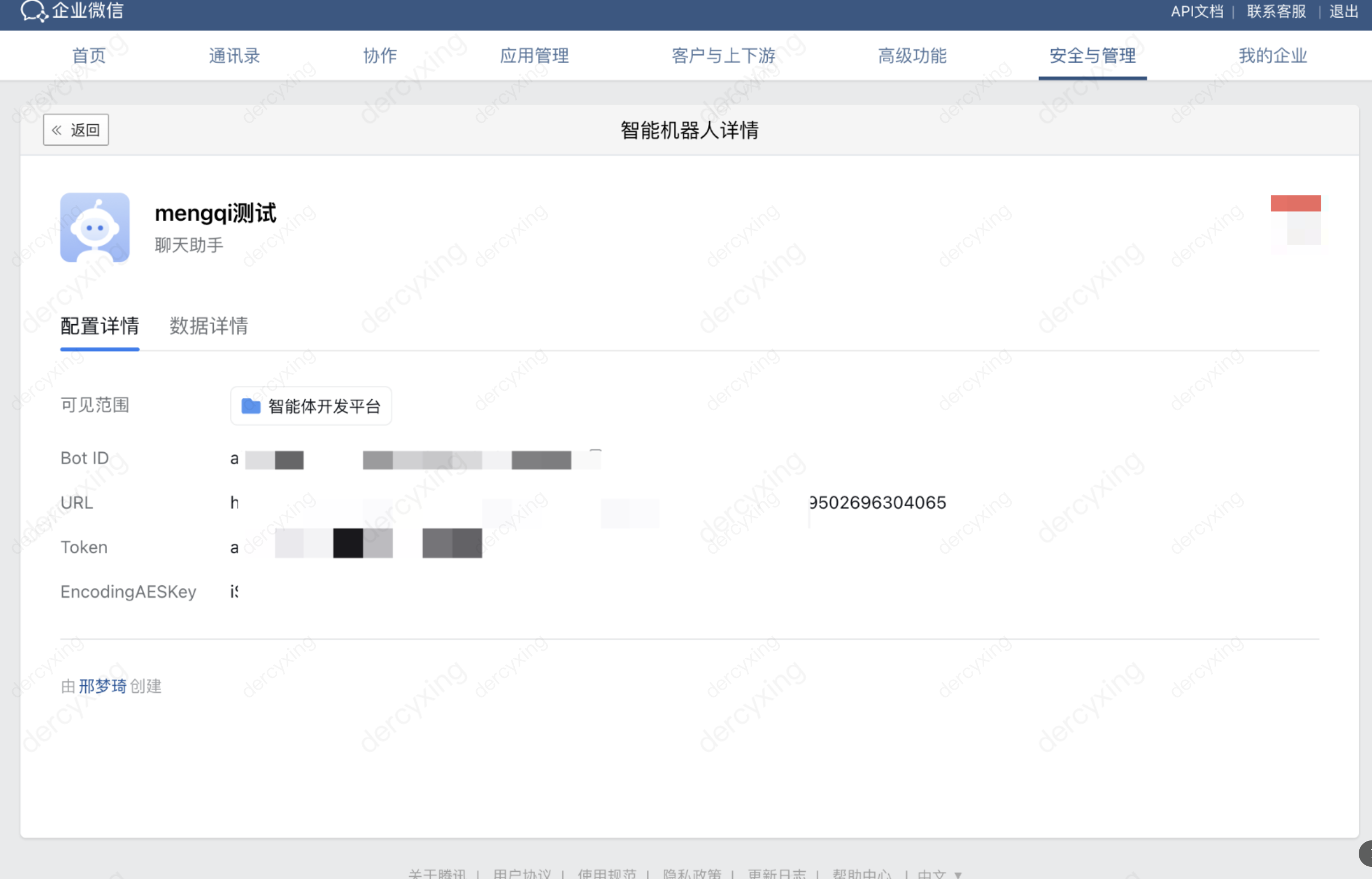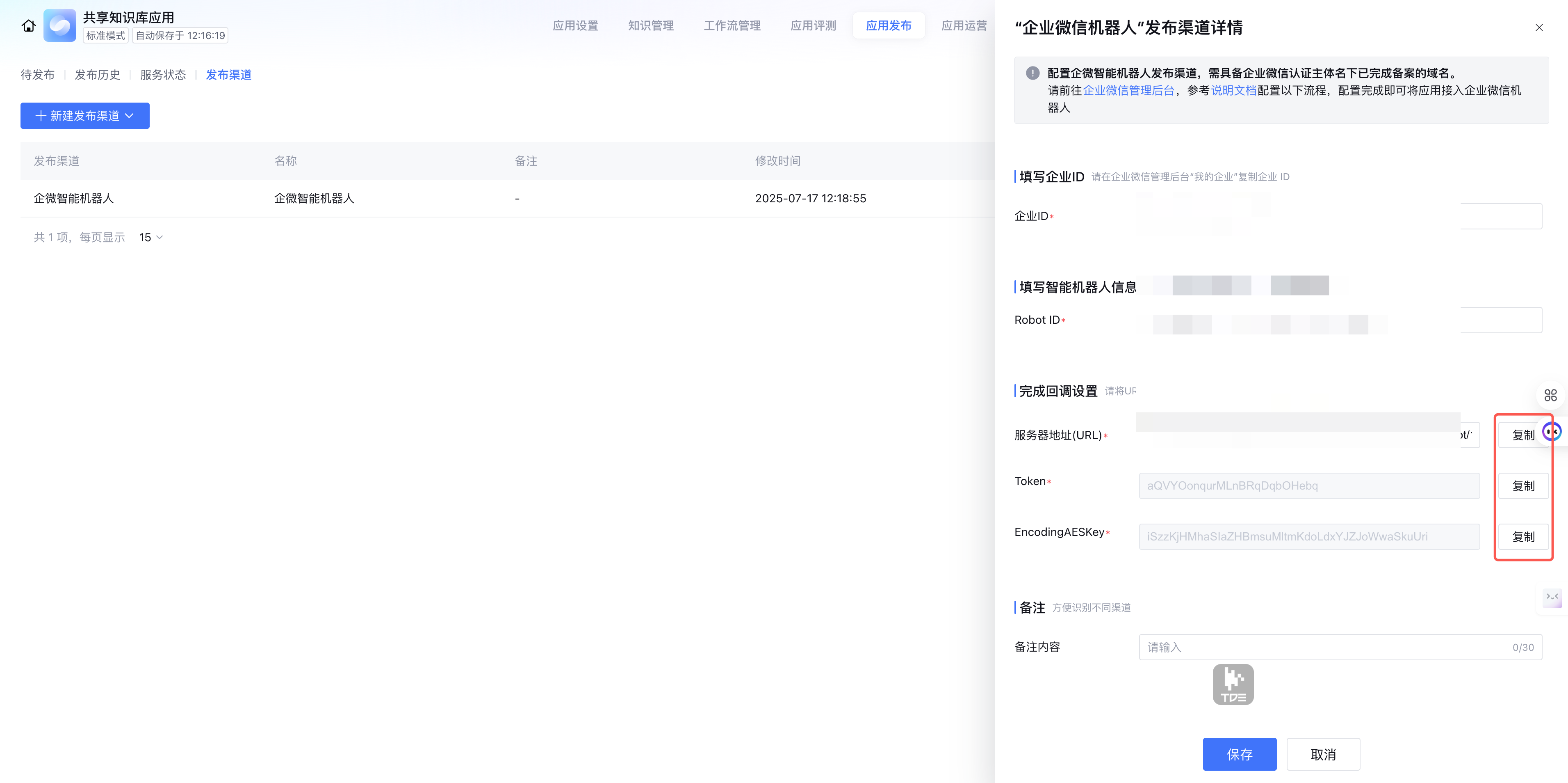 1. 在智能体开发平台,进入刚创建的企微智能机器人渠道详情页面,复制对应参数。