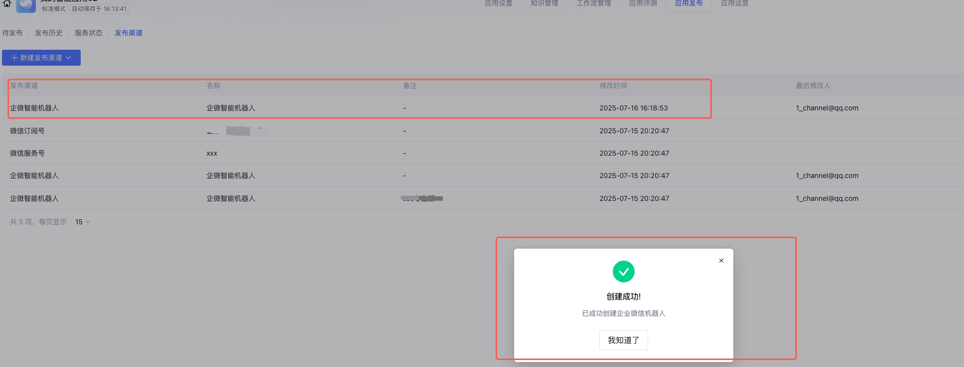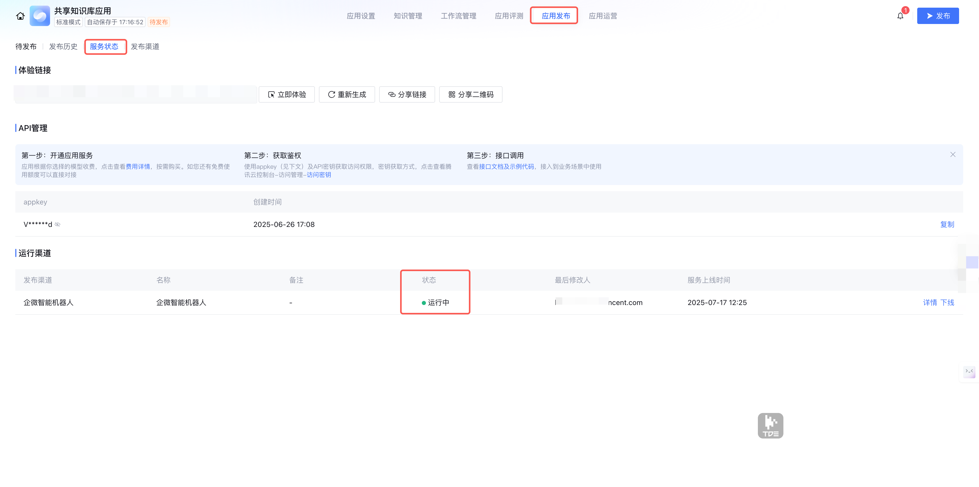 2. 发布成功后,在应用发布 > 服务状态 中可以查看发布渠道的状态。