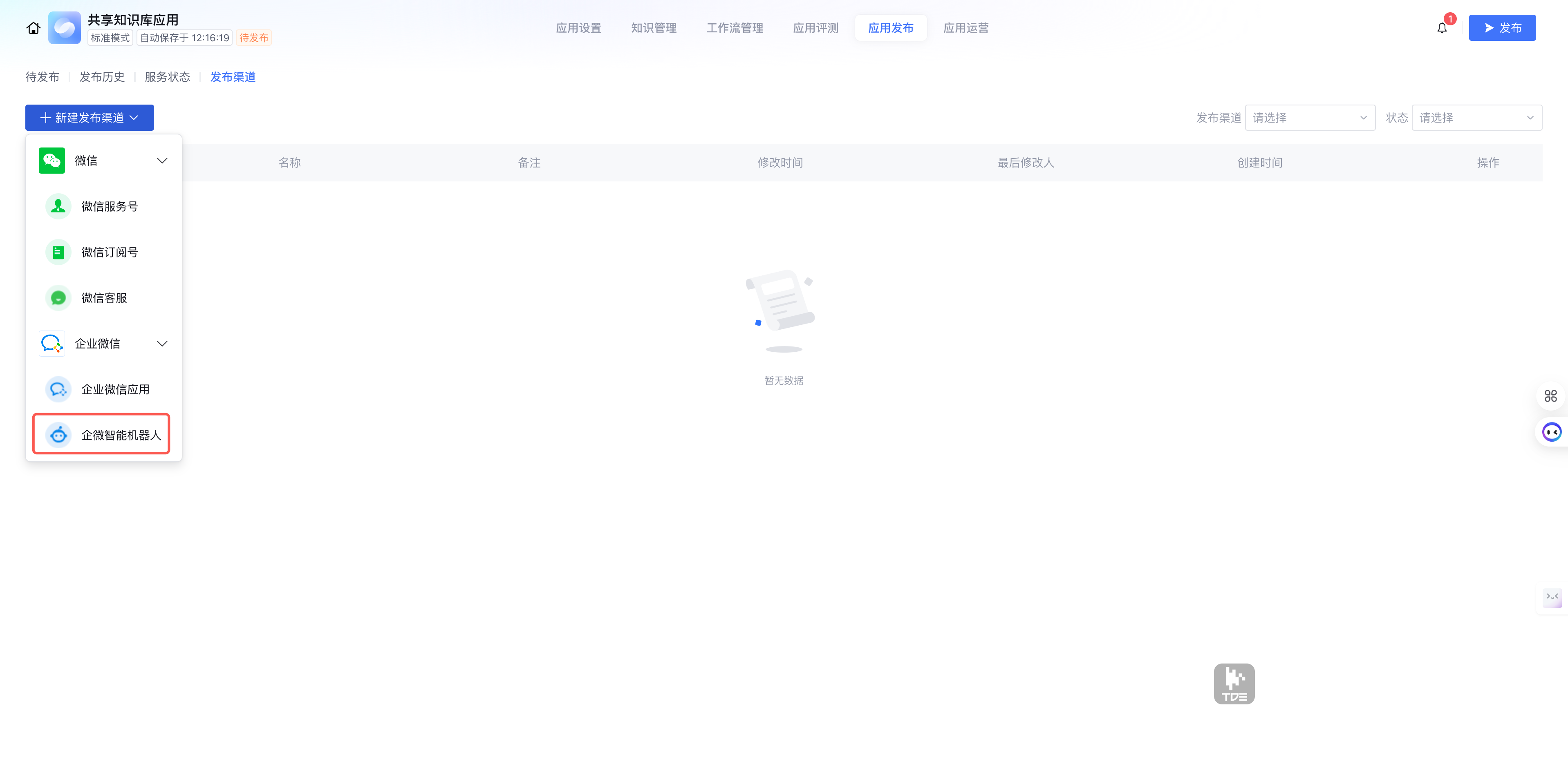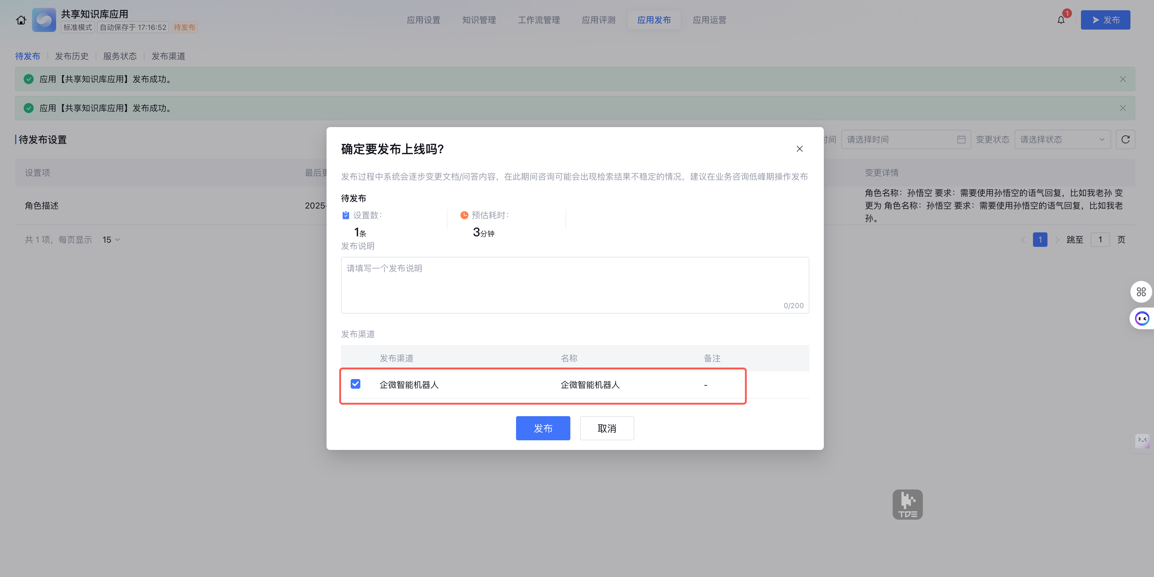 如果应用刚刚发布过,发布按钮无法点击,可以修改应用配置、知识管理中的内容后发布。