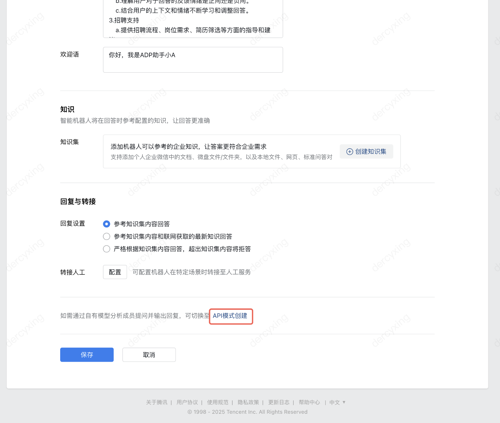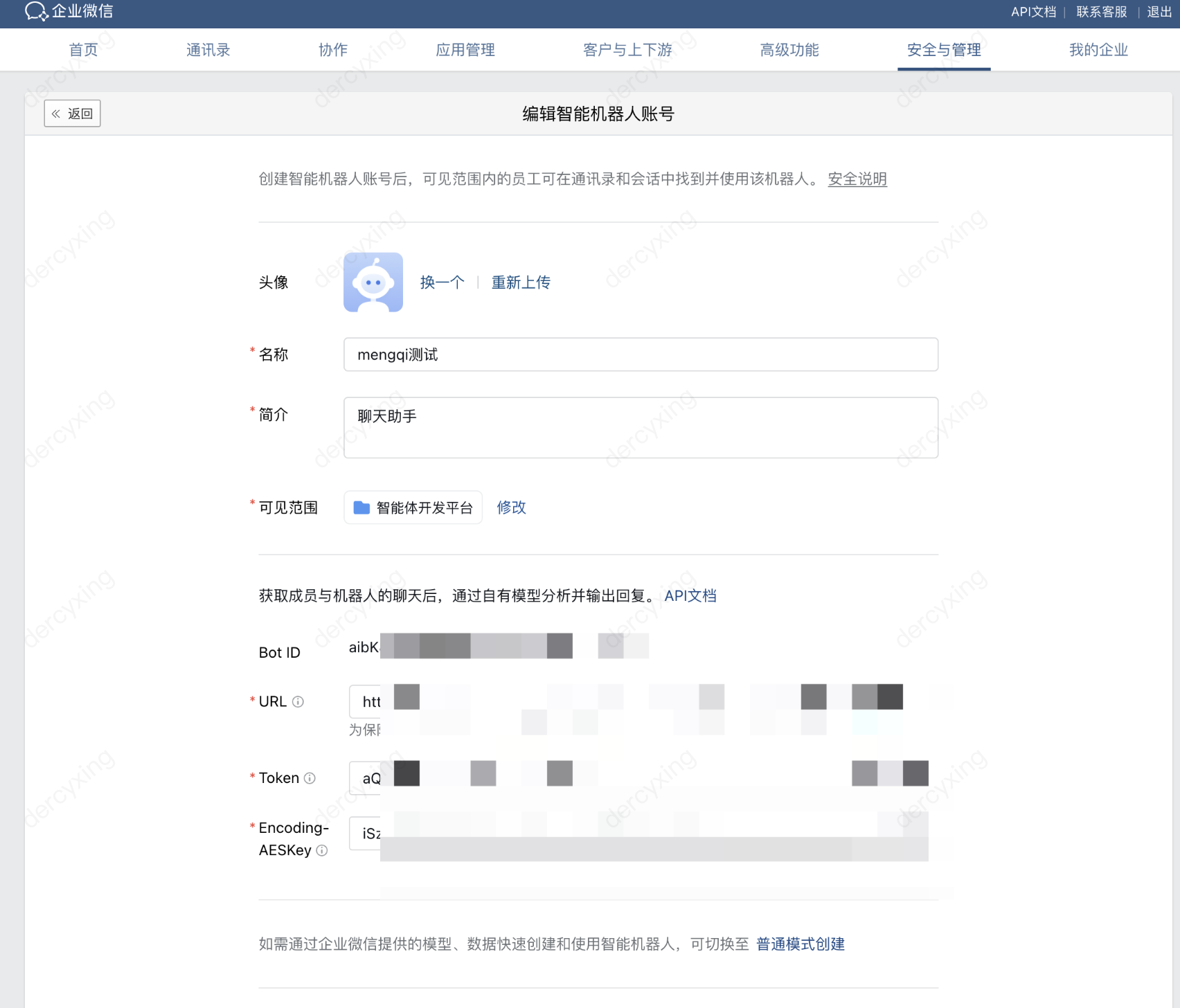 2. 在企业微信管理后台智能机器人的编辑页面(参考步骤三),在 API 模式下填入智能体开发平台中获取的参数信息。 3. 点击保存后自动进入到下图页面,配置成功。