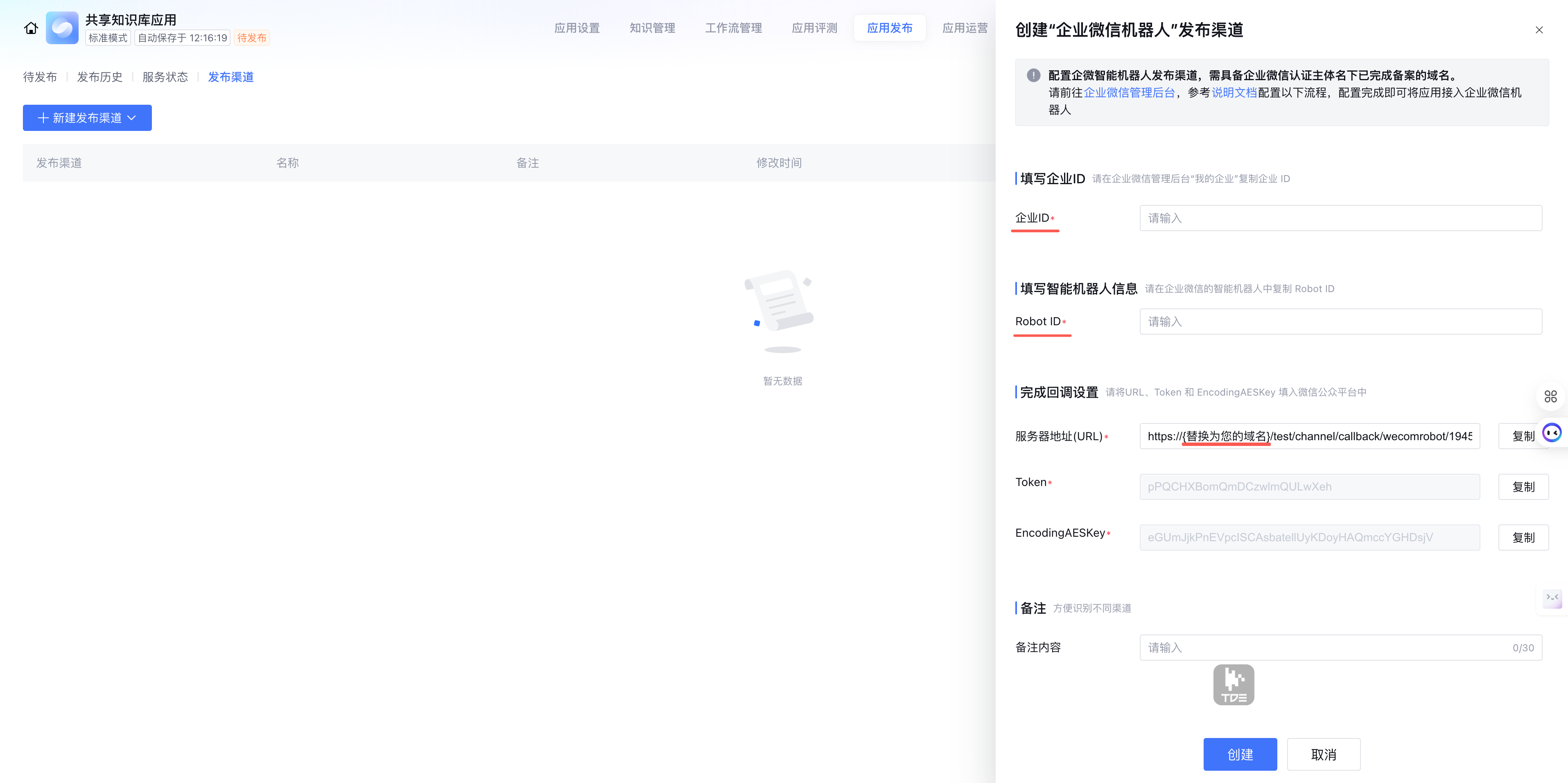 1. 登录 腾讯云智能体开发平台,进入应用开发 > 查看应用 > 应用发布 > 发布渠道,单击新建发布渠道,选择企微智能机器人。 2. 填入上述步骤复制的 企业ID 和 Bot ID,并在服务器地址(URL)中替换为您的域名。