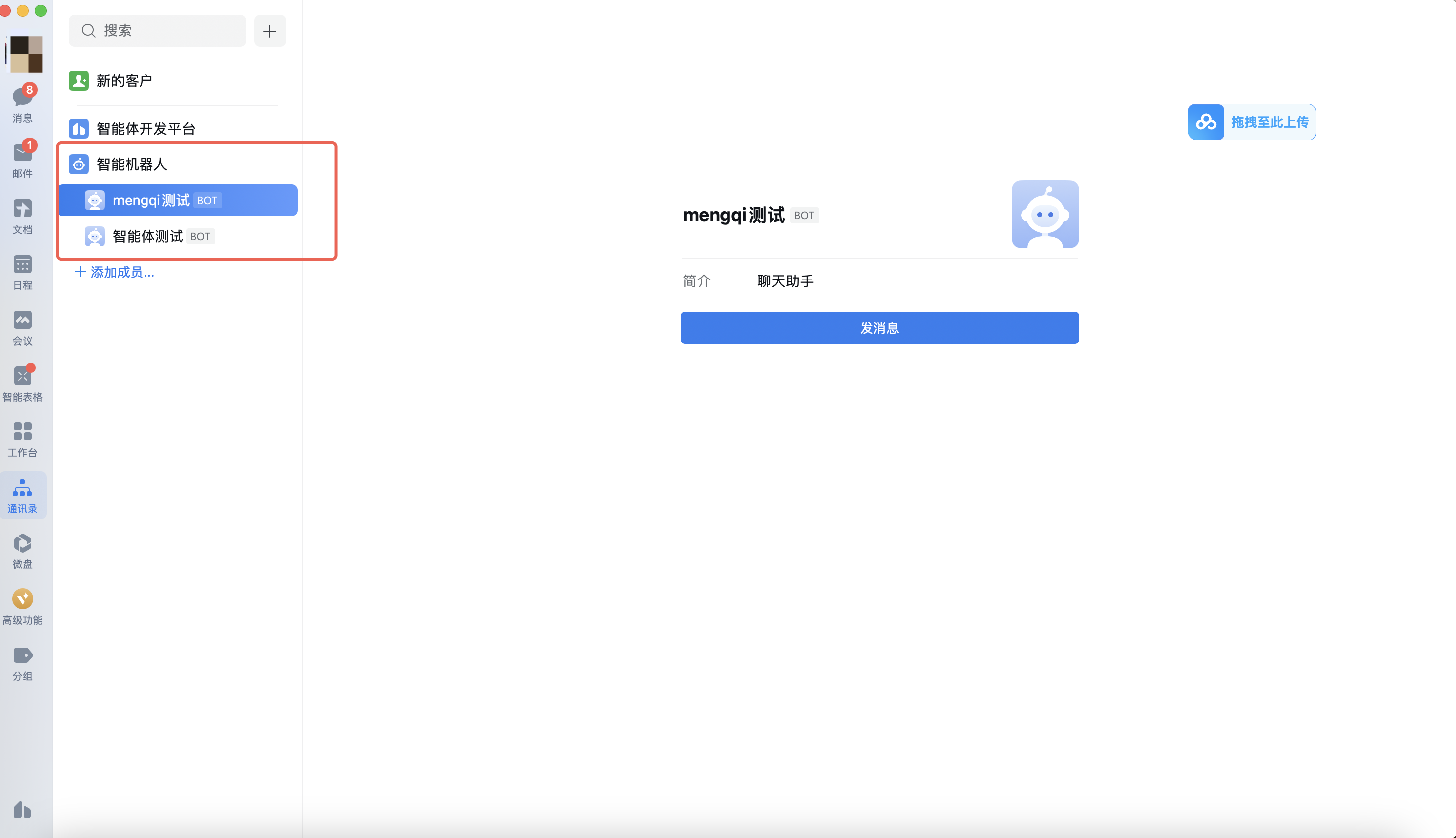 1. 用户登录企业微信客户端,进入通讯录找到智能机器人可以发起单聊。