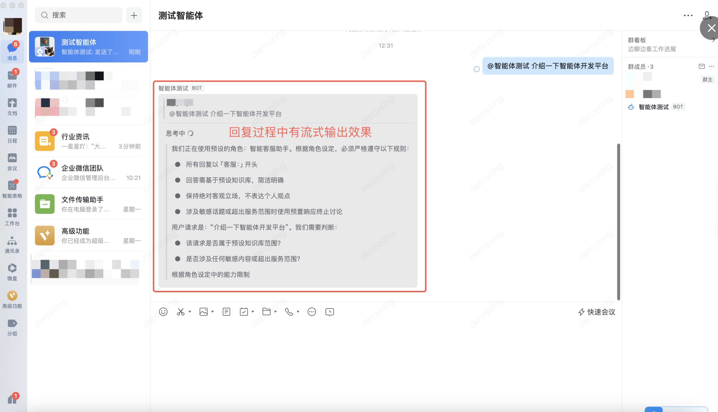 您可以将智能体开发平台中的应用发布到企微智能机器人中使用,与企业微信应用不同,机器人支持流式效果回复。