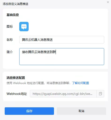5. 上传图标头像并填写机器人名称以及简介后,复制 Webhook 地址,单击保存添加机器人。