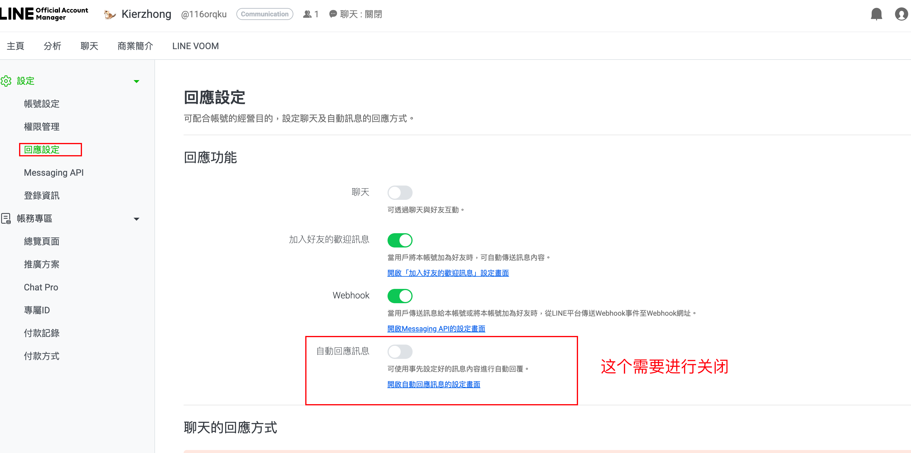 在设置-回应设定中,关闭自动回应讯息。