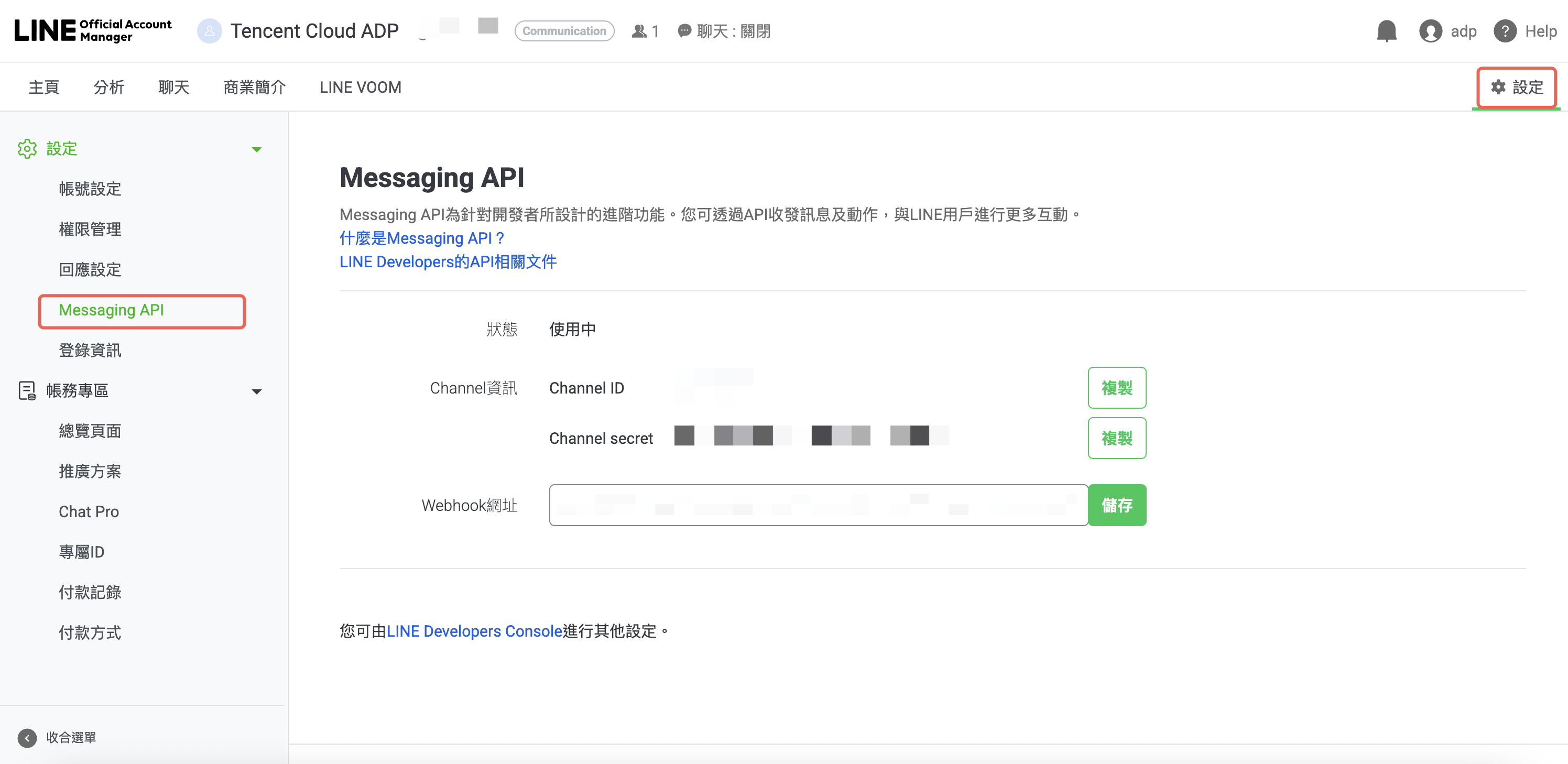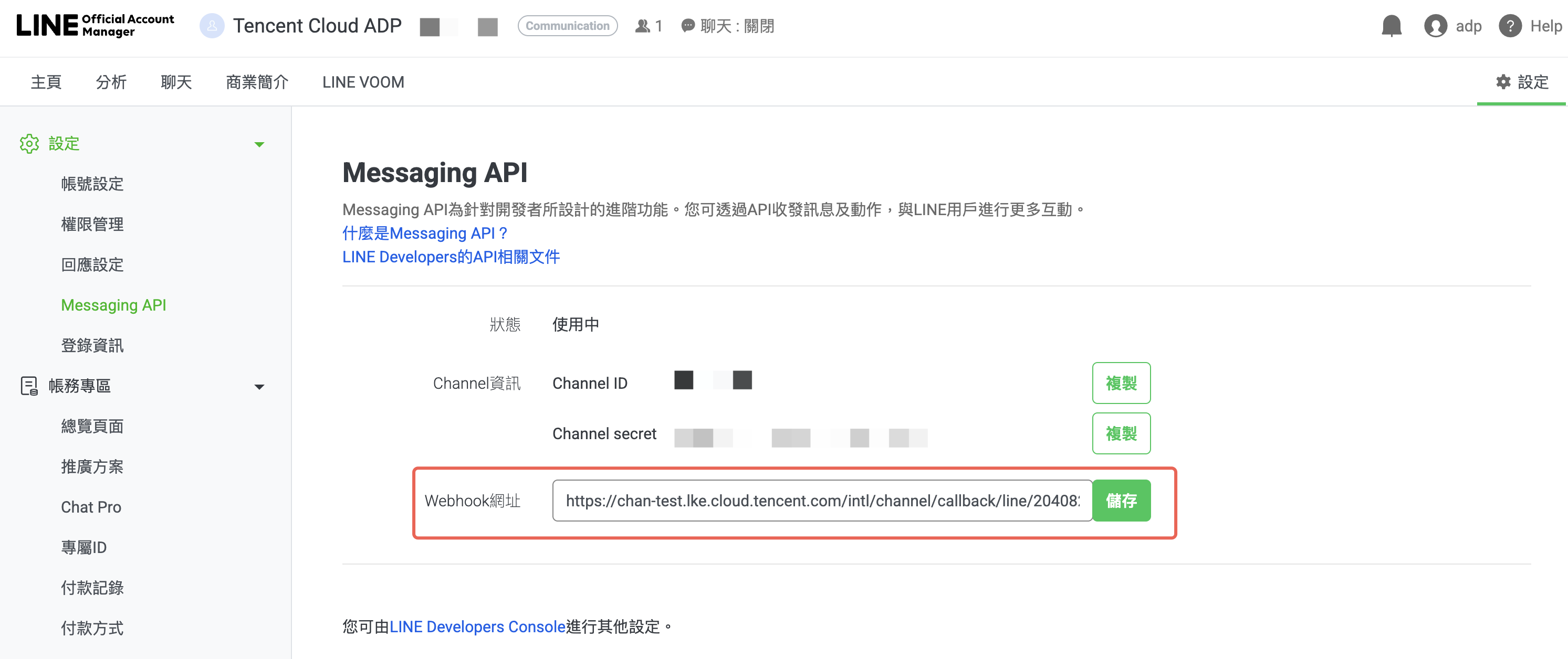 3. 将完成回调设置中的 Webhook URL 信息填入 LINE Messaging API 设置中。