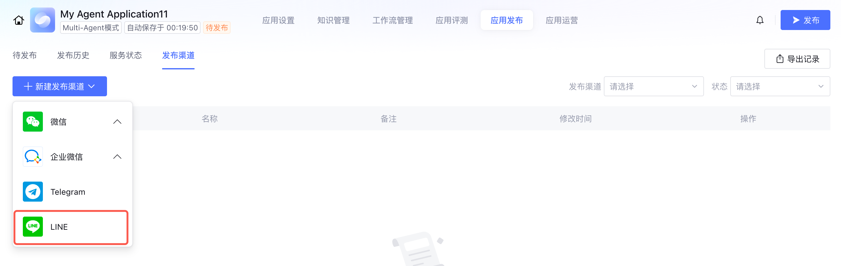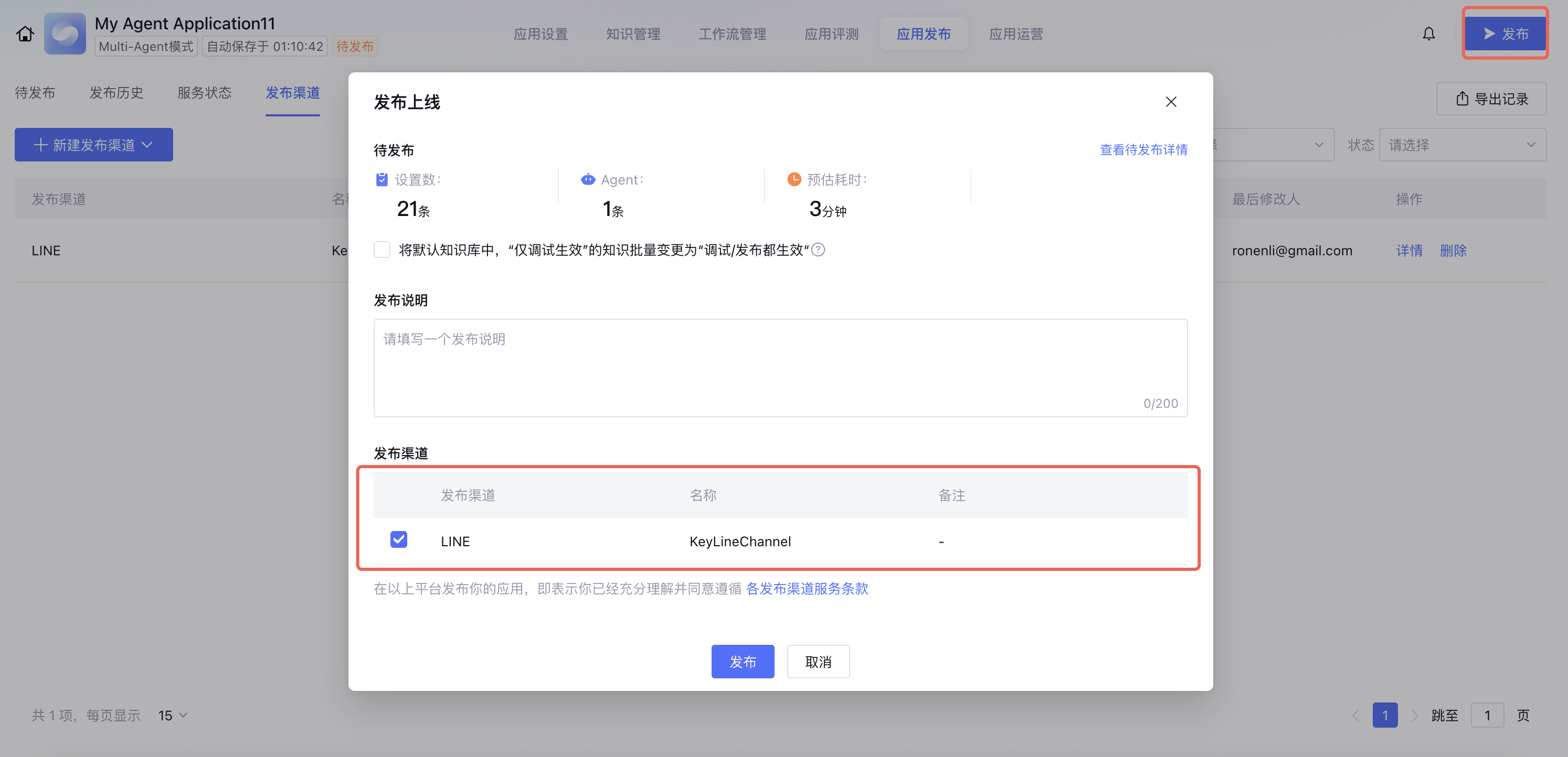 4. 发布应用时选择 LINE 渠道。成功发布后,您可以前往 LINE 与智能体对话。