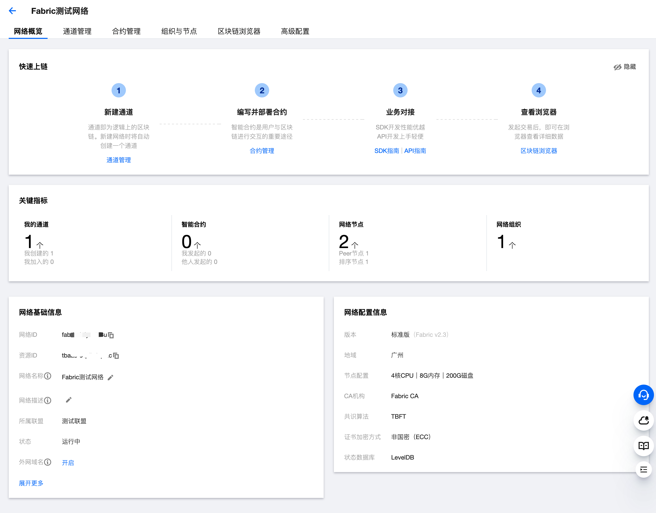 3. 进入网络详情页后,默认定位至网络概览页签,概览页中提供快速上链的指引及功能跳转入口。