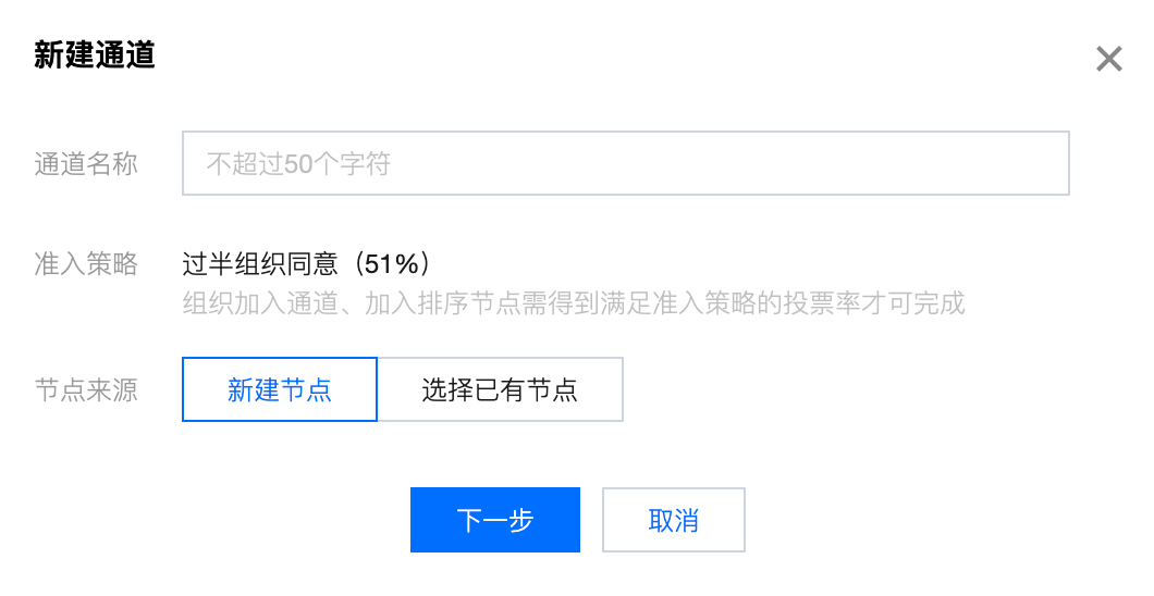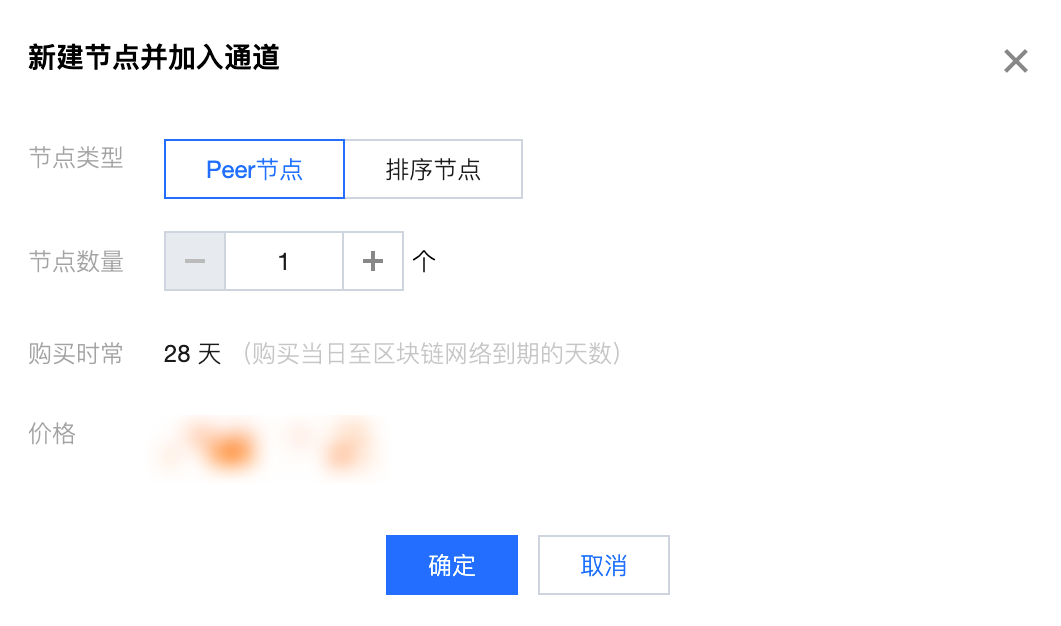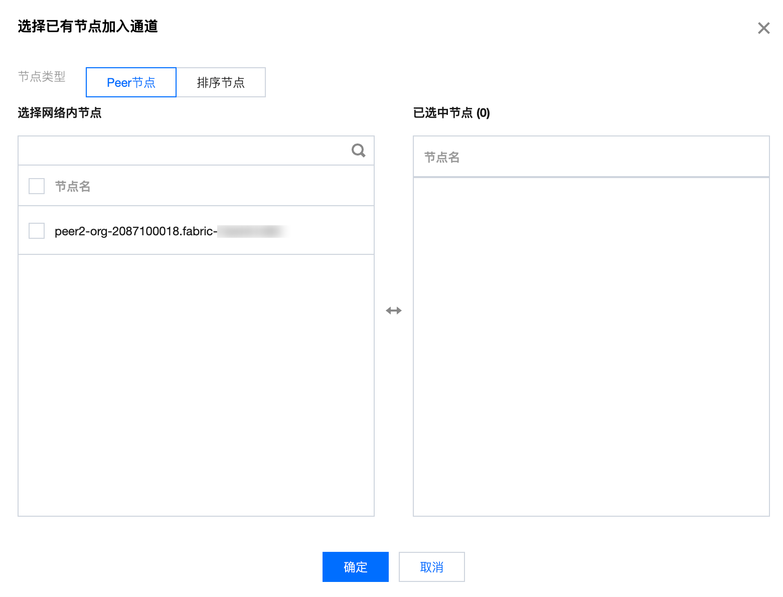 新建 Peer 节点时完成采购后即可加入。新建排序节点加入通道时将发起投票,需通道内的组织投票后满足准入率后才可采购节点并加入,发起后,投票进展可在 事件中心 查看。 4. 单击确定。