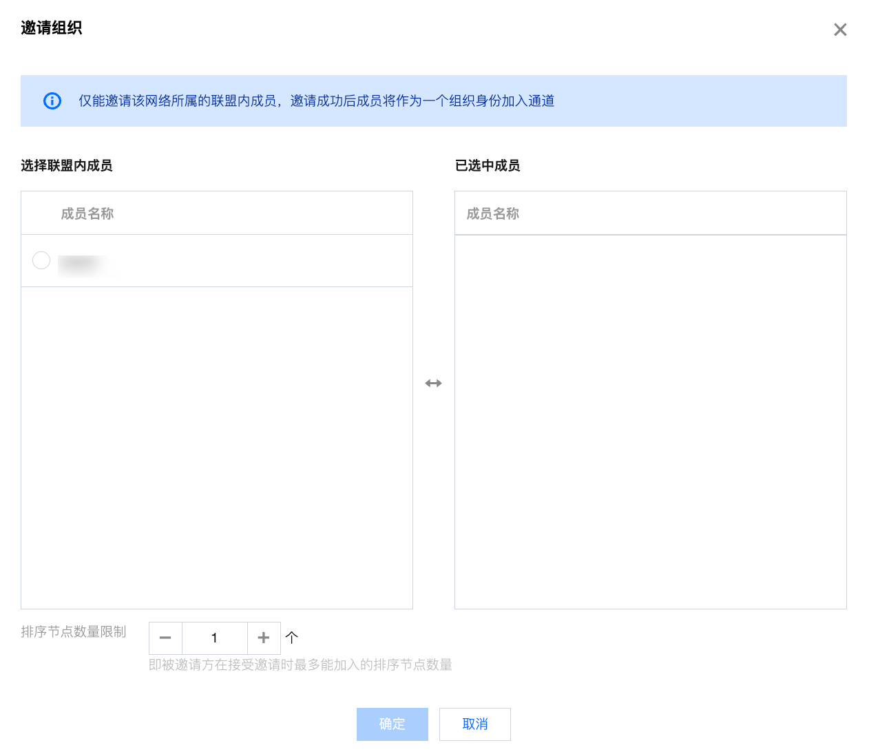 3. 在弹窗中即可选择邀请联盟内的成员,邀请成功后成员将作为一个组织身份加入通道,发起邀请时还可设置对方接受邀请时可加入的排序节点数量限制,可根据业务所需设置数量。如下图所示: